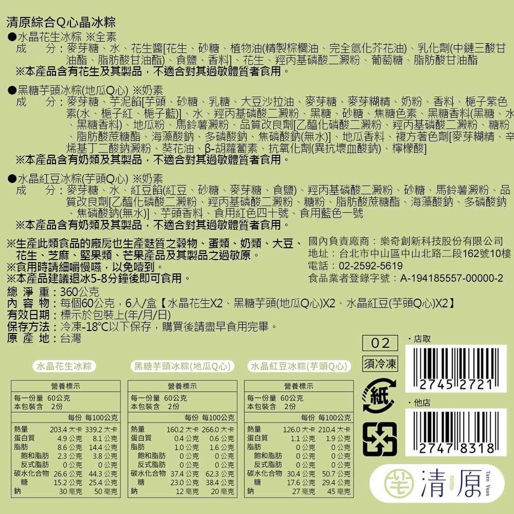 1.商品組合/規格:【清原】綜合Q心晶冰粽禮盒(6入/盒) x2盒2.商品品名:【清原】綜合Q心晶冰粽禮盒(6入/盒)3.內容成分:◆水晶花生冰粽(全素):麥芽糖、水、花生醬[花生、砂糖、植物油(精製棕櫚油、完全氫化芥花油)、乳化劑(中鏈三酸甘油酯、脂肪酸甘油酯)、食鹽、香料]、花生、羥丙基磷酸二澱粉、葡萄糖、脂肪酸甘油酯。※本產品含有花生及其製品,不適合對其過敏體質者食用。◆黑糖芋頭冰粽(地瓜Q心)(奶素):麥芽糖、芋泥餡[芋頭、砂糖、乳糖、大豆沙拉油、麥芽糖、麥芽糊精、奶粉、香料、梔子紫色素(水、梔子紅、梔子藍)]、水、羥丙基磷酸二澱粉、黑糖、砂糖、焦糖色素、黑糖香料(黑糖、水、黑糖香料)、地瓜粉、馬鈴薯澱粉、品質改良劑[乙醯化磷酸二澱粉、羥丙基磷酸二澱粉、糖粉、脂肪酸蔗糖酯、海藻酸鈉、多磷酸鈉、焦磷酸鈉(無水)]、地瓜香料、複方著色劑[麥芽糊精、辛烯基丁二酸鈉澱粉、葵花油、β-胡蘿蔔素、抗氧化劑(異抗壞血酸鈉)、檸檬酸]。※本產品含有奶類及其製品,不適合對其過敏體質者食用。◆水晶紅豆冰粽(芋頭Q心)(奶素):麥芽糖、水、紅豆餡(紅豆、砂糖、麥芽糖、食鹽)、羥丙基磷酸二澱粉、砂糖、馬鈴薯澱粉、品質改良劑[乙醯化磷酸二澱粉、羥丙基磷酸二澱粉、糖粉、脂肪酸蔗糖酯、海藻酸鈉、多磷酸鈉、焦磷酸鈉(無水)]、芋頭香料、食用紅色四十號、食用藍色一號。※本產品含有奶類及其製品,不適合對其過敏體質者食用。4.商品重(容)量:360g(水晶花生60g*2顆+黑糖芋頭(地瓜Q心)60g*2顆+水晶紅豆(芋頭Q心)60g*2顆)/盒5.原產地(國):台灣6.保存期限:-18℃以下冷凍 6個月(實際依商品包裝標示)7.製造廠商或國內負責廠商名稱:樂奇創新科技股份有限公司8.製造廠商或國內負責廠商地址:104027 台北市中山區中山北路二段162號10樓9.製造廠商或國內負責廠商電話:02-2592-561910.食品業者登錄字號:A-194185557-00000-211.投保產品責任險字號:明台產物保險 0803-14PDT00874號