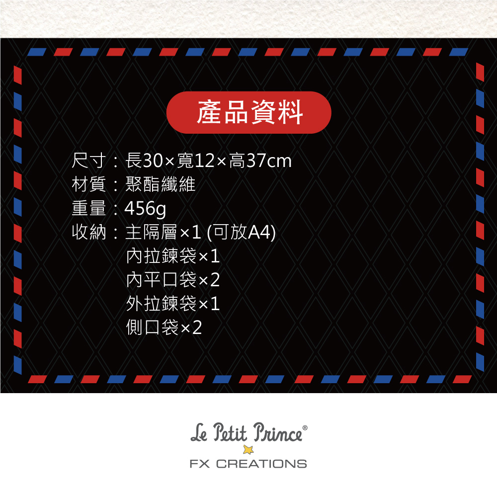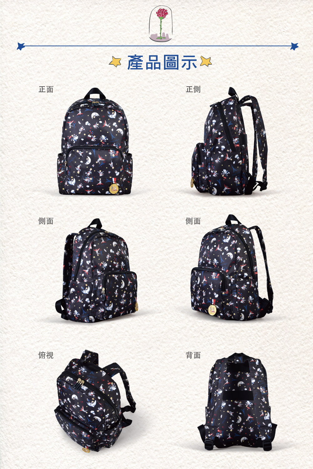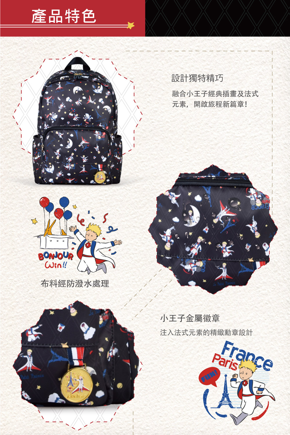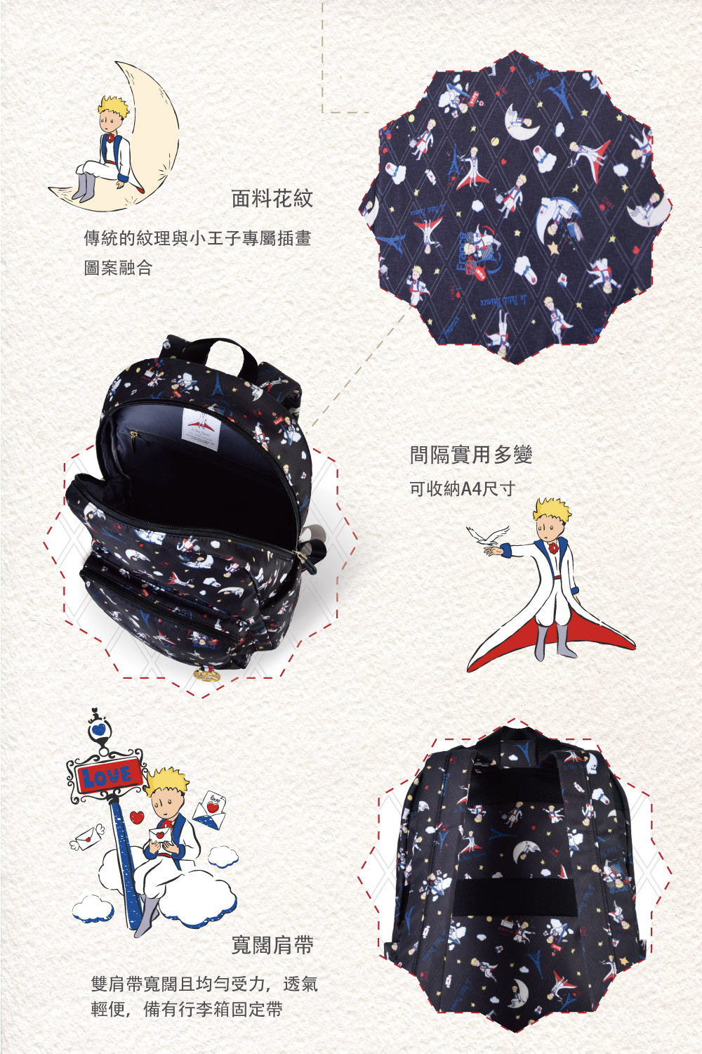商品特色小王子Le Petit Prince聯名系列精緻勳章設計LOGO防潑水面料大容量設計可套行李箱拉桿的貼心設計