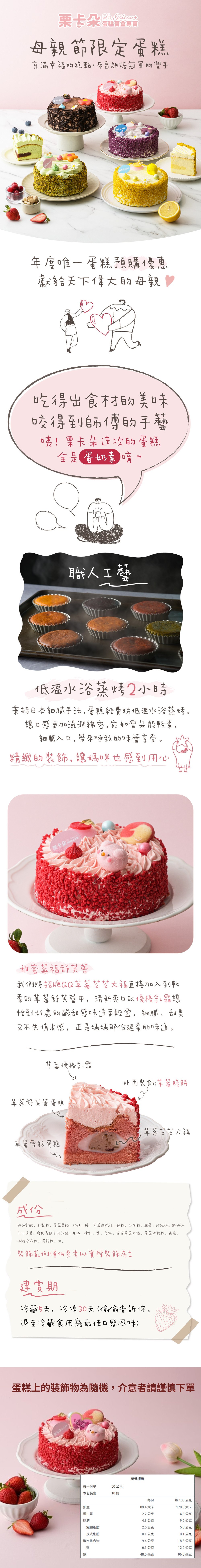 商品內容商品組合/規格:6吋蛋糕(500g±10%)商品品名:甜蜜莓福舒芙蕾商品重(容)量:500g±10%內容物成分(如含有豬、牛成分請加註國別):蛋糕本體-奶油乳酪、紅麴粉、草莓果餡、奶油、糖、草莓濃縮汁、麵粉、玉米粉、雞蛋、沙拉油、鮮奶油、卡士達醬、優格、馬斯卡邦乳酪、牛奶、煉乳、鹽、香料、芝芝草莓大福、草莓凍乾粉食品添加物名稱:如成分所示過敏原資訊:本產品含有牛奶、蛋、麩質的穀類,不適合對其過敏體質者食用原產地(國):台灣保存期限:冷藏5天,冷凍30天食用方式:退至冷藏食用為最佳口感風味