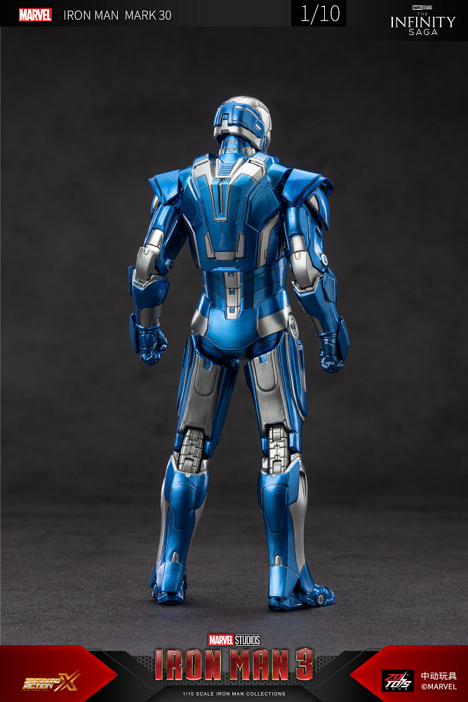 鋼鐵人「Mark 30」主要的配色為藍色、銀色,因此其又被稱為「藍鋼」(Blue Steel)。而這套鋼鐵裝甲是馬克33「銀色百夫長」的原型機,因此在造型上是以多處倒三角的造型呈現,其中在胸口反應爐的部分也是。值得一提的是,這款作品在裝甲上藍色、銀色雙色搭配著金屬質感效果的塗裝非常好看。