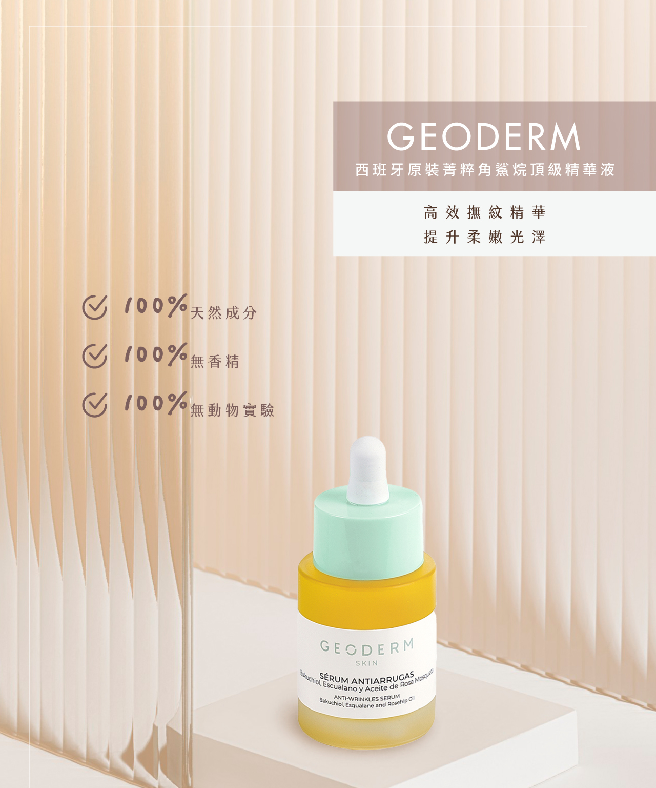 高效撫紋精華,提升柔嫩光澤100%天然成分 | 100%無香精 | 100%無動物實驗