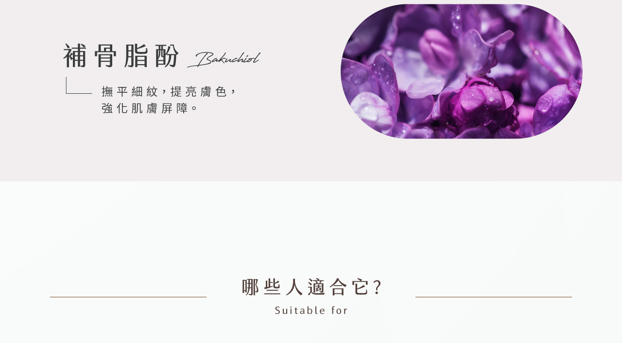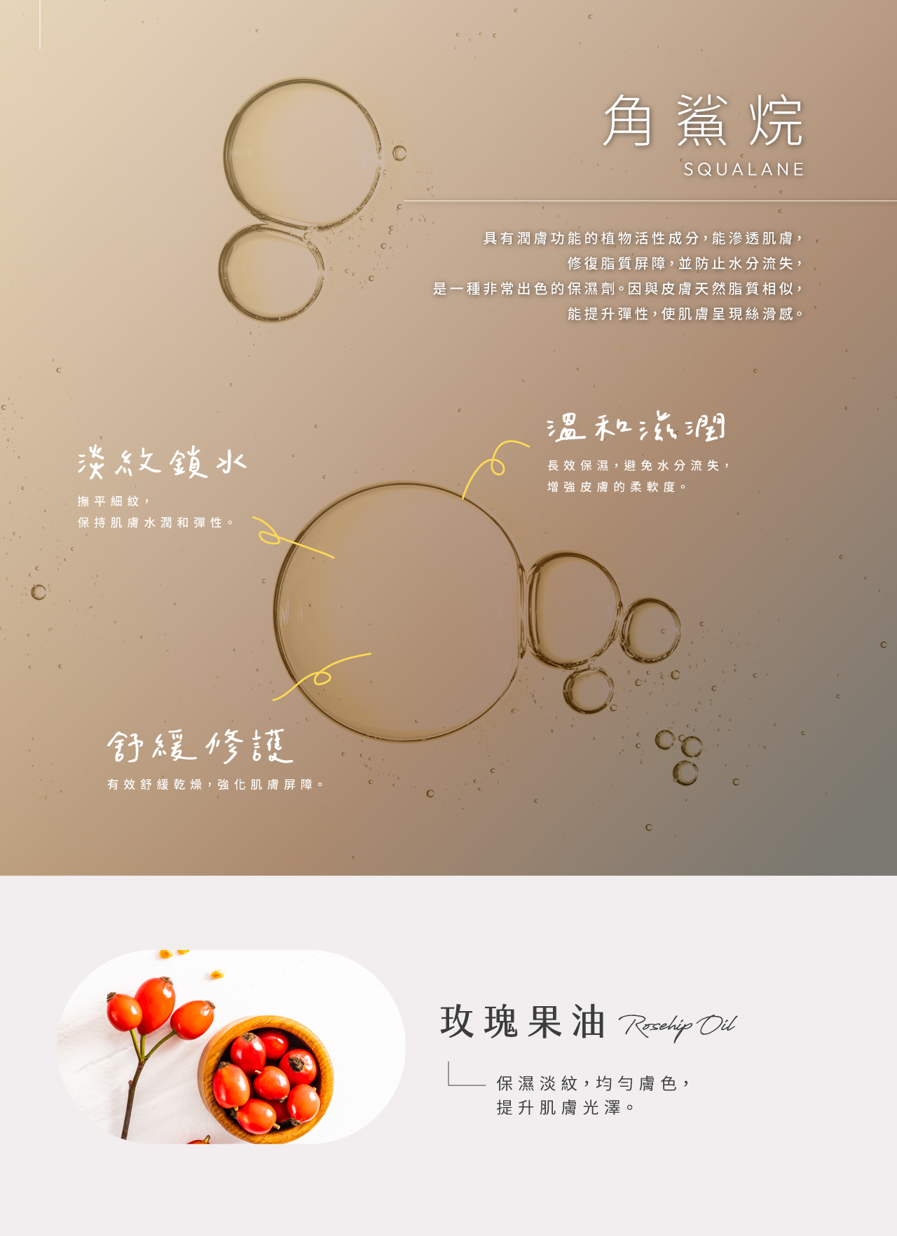 玫瑰果油_保濕淡紋,均勻膚色,提升肌膚光澤。補骨脂酚 (Bakuchiol)_撫平細紋,提亮膚色,強化肌膚屏障。