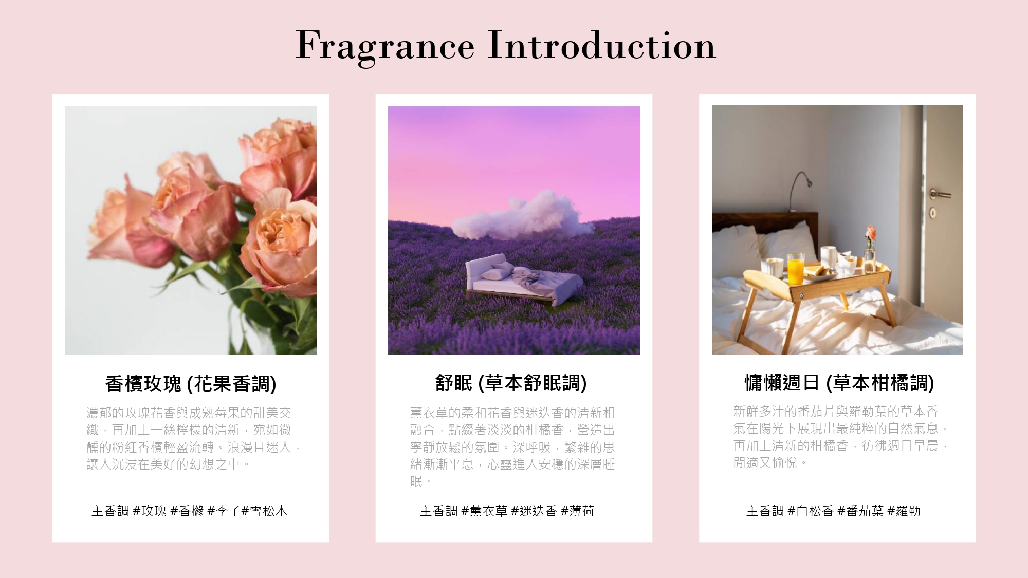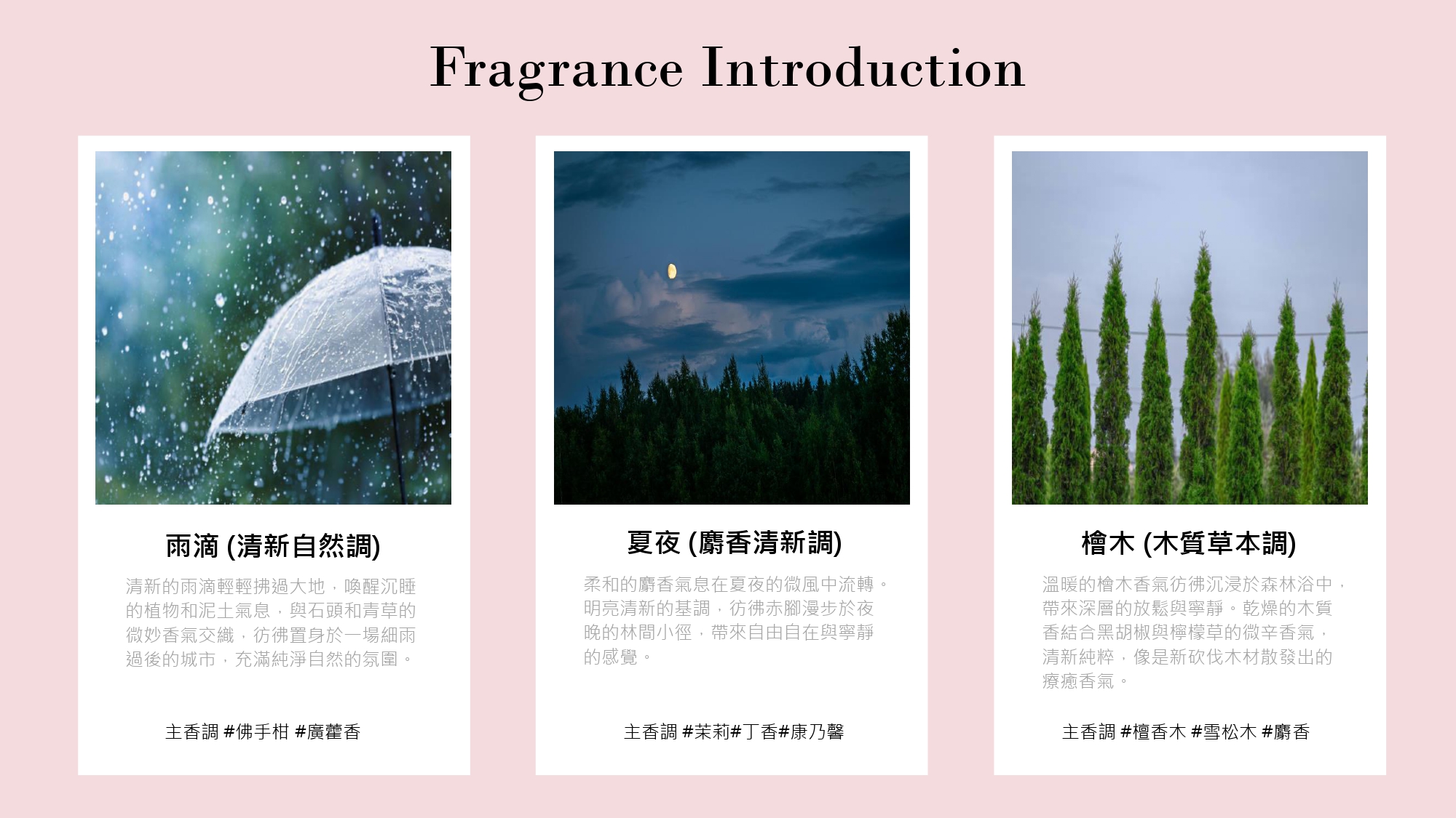 香味❤️黎泰院565 (綠意花香調) :主香調 #紫萼 #天竺葵 #丁香 #木蘭❤️舒眠 (草本舒眠調) :主香調 #薰衣草 #迷迭香 #薄荷❤️慵懶週日 (草本柑橘調) :主香調 #白松香 #番茄葉 #羅勒❤️雨滴 (清新自然調) :主香調 #佛手柑 #廣藿香❤️檜木 (木質草本調) : 主香調 #檀香木 #雪松木 #麝香