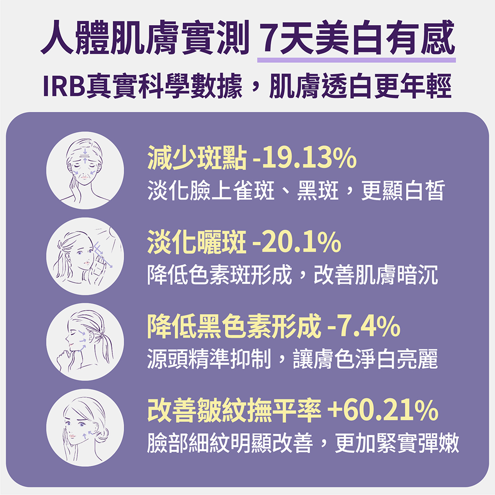➤IRB人體肌膚試驗佐證,7天有感淡斑美白