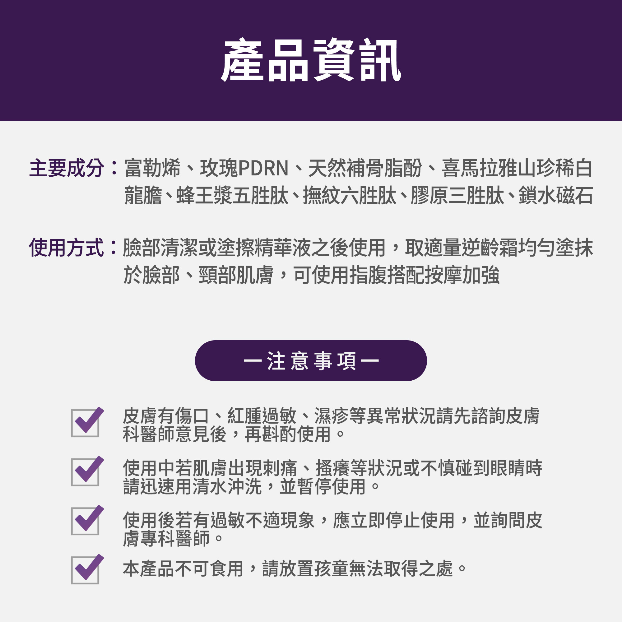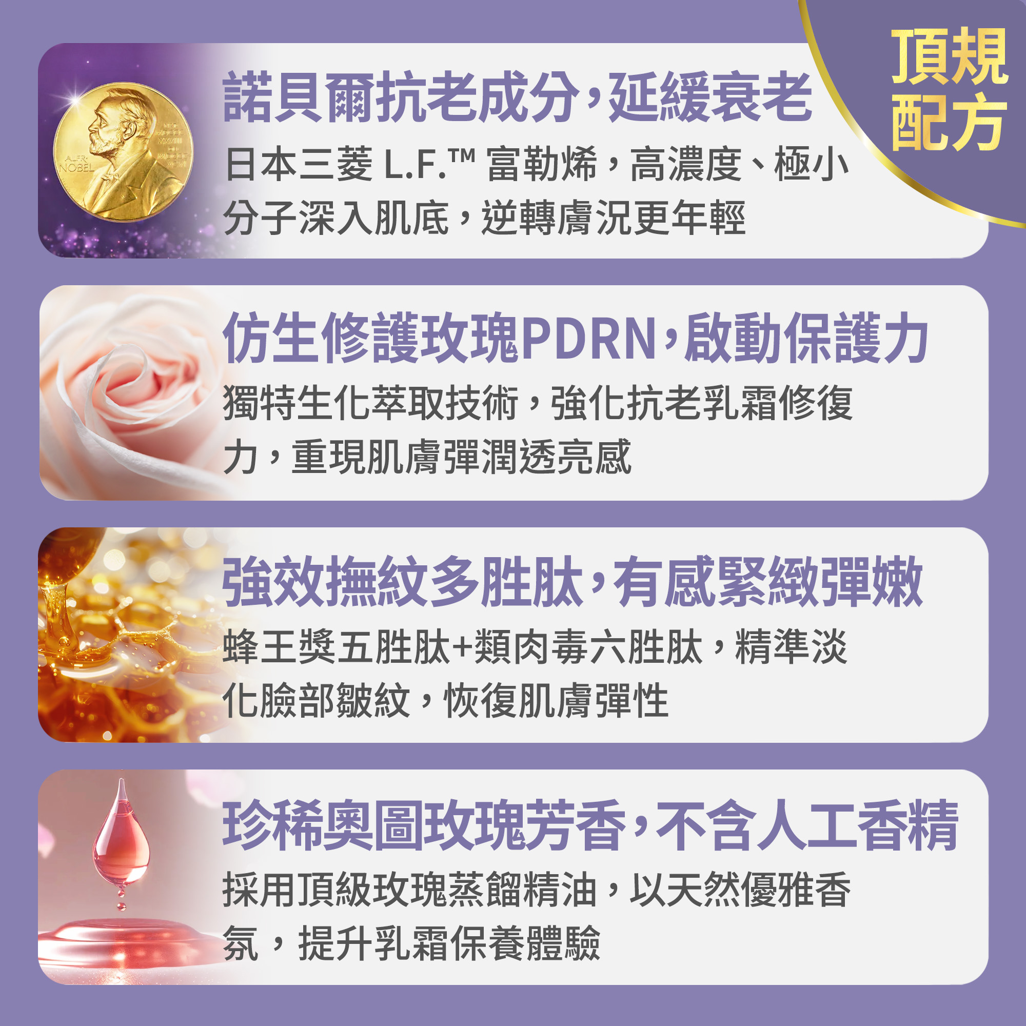 如果為熟齡肌肌膚比較乾燥、或有細紋皺紋需要修護,會建議使用進階的富勒烯肌因逆齡霜,玫瑰凍齡是保濕乳霜,可基礎補水、補油保濕潤澤使用!