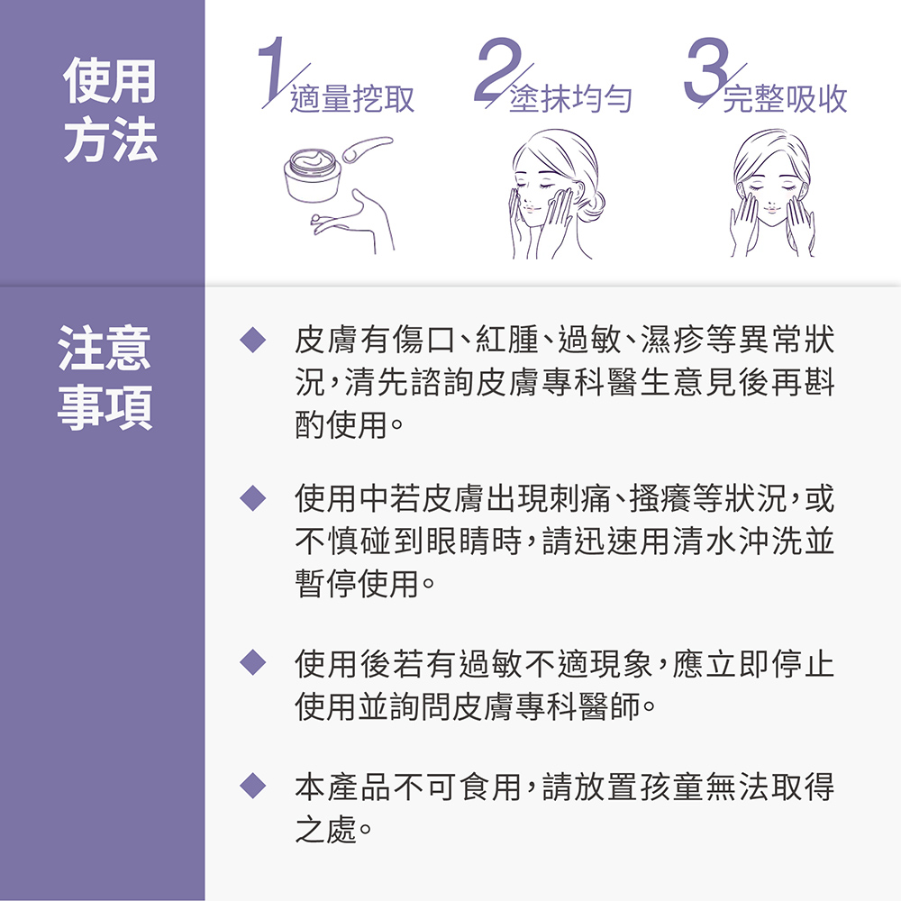 1.皮膚有傷口、紅腫、過敏、濕疹等異常狀況,請先諮詢皮膚科醫師意見後,再斟酌使用。