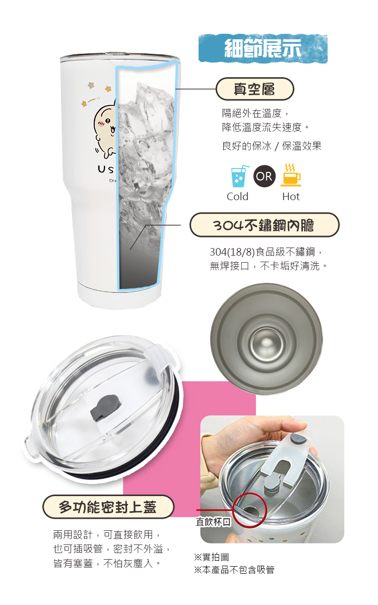 ●長效保冰保溫不鏽鋼杯●杯身雙層設計,保冷保溫效果佳,好清洗,無異味●杯口10公分廣口設計,可放入冰塊●兩用密封杯蓋,吸管/直飲,圓潤杯口不傷唇●大容量,杯身好握好拿,加厚防滑杯底,不易傾倒●食品級PP材質杯蓋,安全健康,密封不易漏●不會結水珠,不燙手,旅行,運動,登山等必備用品