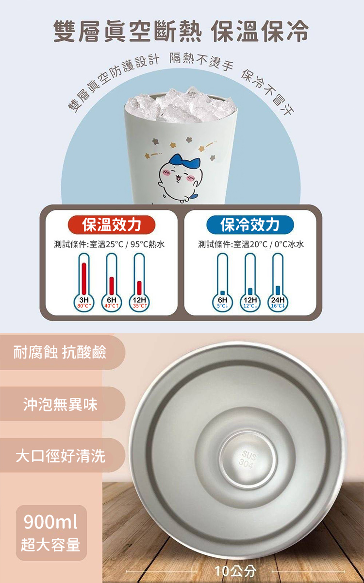 材質:杯身-內部304不鏽鋼 外部201不鏽鋼 杯蓋-PP聚丙烯 密封圈-矽膠 尺寸:杯身-約7x10x20cm(含上蓋)包裝盒尺寸:約21.5×10.5×10.5公分容量:約900ml重量:本體約320g、含包裝約400g(手工量正負誤差3%)口徑:約10cm耐熱溫度:杯身0°C~100°C 杯蓋0°C~90°C保溫效力:40℃約6小時保冷效力:5℃約6小時產地:中國授權公司:Chiikawa吉伊卡哇