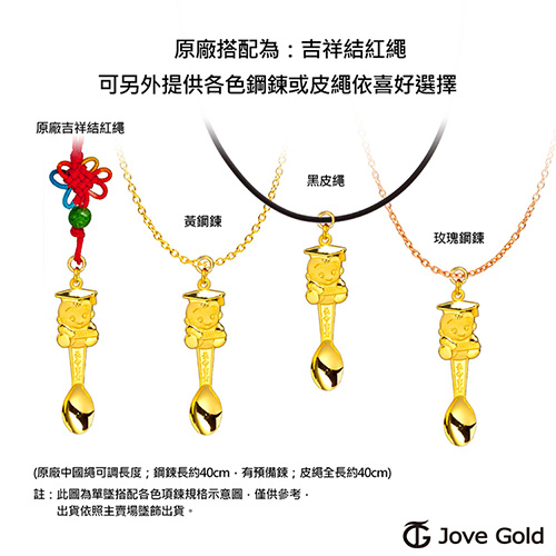 此商品原廠搭配紅色編織吉祥結中國繩,若想更換,可選擇加價購升級金鍊,或可選鋼鍊款式及黑色皮繩。墜飾可搭配各色鋼鍊或黃金項鍊,網頁內有商品示意圖可供參考,黃色鋼鍊與純金項鍊外觀極像,但材質不同,下標前請先參考網頁內容(搭配之鋼鍊/皮繩可能因電腦螢幕不同造成色差,以實際出貨為準)