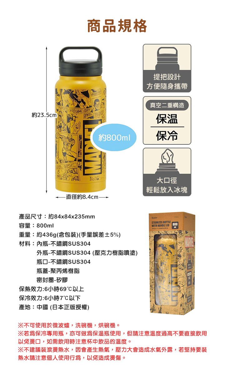品牌:日本SKATER原廠公司貨-平行輸入包裝尺寸:約90x90x240mm產品尺寸:約84x84x235mm容量:800ml重量:約436g(含包裝)(手量誤差±5%)材料:內瓶-不鏽鋼SUS304 外瓶-不鏽鋼SUS304 (壓克力樹脂噴塗) 瓶口-不鏽鋼SUS304 瓶蓋-聚丙烯樹脂 密封圈-矽膠保熱效力:6小時69℃以上保冷效力:6小時7℃以下產地:中國 (日本正版授權)