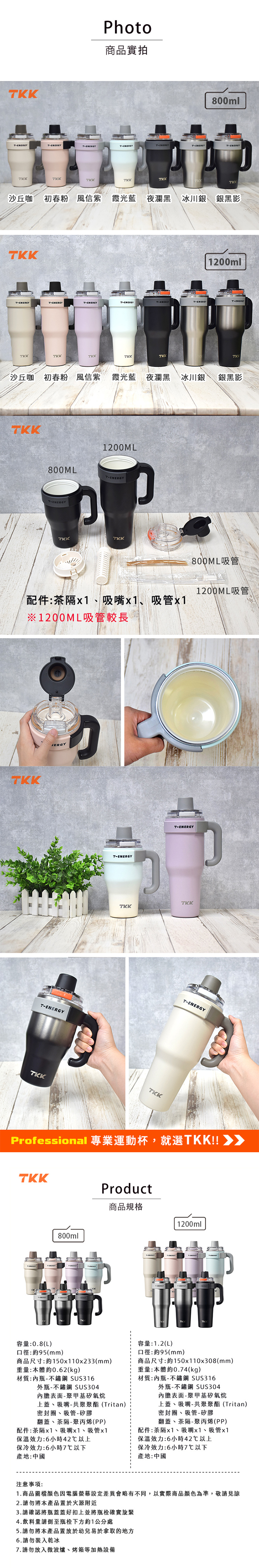 容量:0.8(L)口徑:約95(mm)商品尺寸:約150x110x233(mm) 包裝尺寸:約143x113x237(mm)重量:本體約0.62(kg)、含包裝約0.71(kg)材質:內瓶-不鏽鋼 SUS316 外瓶-不鏽鋼 SUS304 內膽表面-聚甲基矽氧烷 上蓋、吸嘴-共聚聚酯 (Tritan) 密封圈、吸管-矽膠 翻蓋、茶隔-聚丙烯(PP)配件:茶隔x1、吸嘴x1、吸管x1保溫效力:6小時42℃以上保冷效力:6小時7℃以下產地:中國