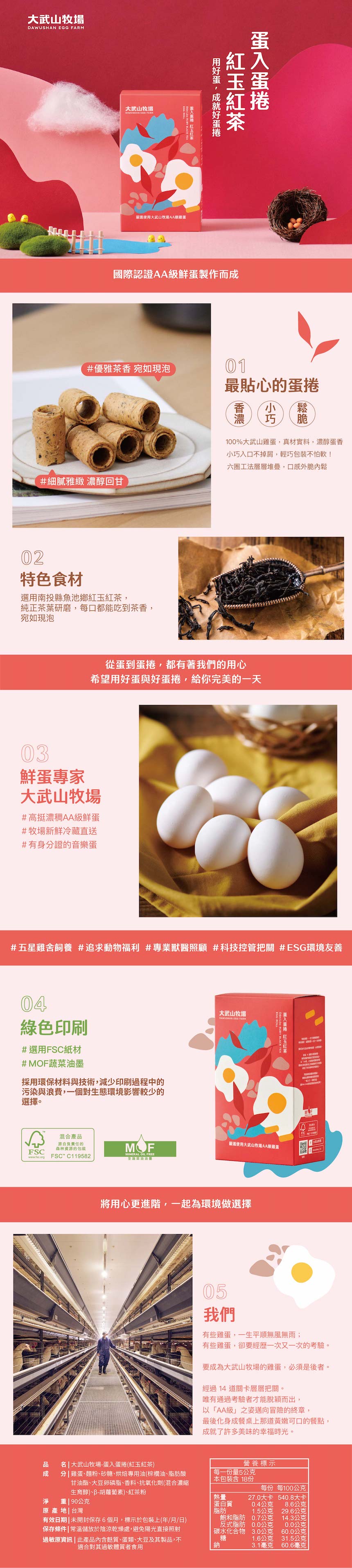 《大武山牧場》以五星級牧場的規格飼養雞隻,從源頭把關品質,所有雞蛋皆須經過14道洗選檢驗的層層把關,才能成為具備國際級水準的AA級鮮蛋!承襲對雞蛋高品質的追求,將之發揚光大,以牧場直送最新鮮的蛋,製成自有的烘焙系列產品「蛋入蛋捲」。「蛋入」取名自雞蛋融入美食之意,同時也是台語伴手禮「等路」的諧音,《大武山牧場》希望將對雞蛋的用心,傳遞在「蛋入蛋捲」中,帶出送禮人最真摯的問候與關心!「大武山牧場 蛋入蛋捲」立志成為最貼心的蛋捲,外觀繽紛亮眼、同時融入永續再利用的精神。輕巧包裝不怕受潮,用好蛋打造出來的好蛋捲,一捲小巧入口不掉屑,保證讓蛋捲控想要一口接著一口,送禮自用兩相宜!