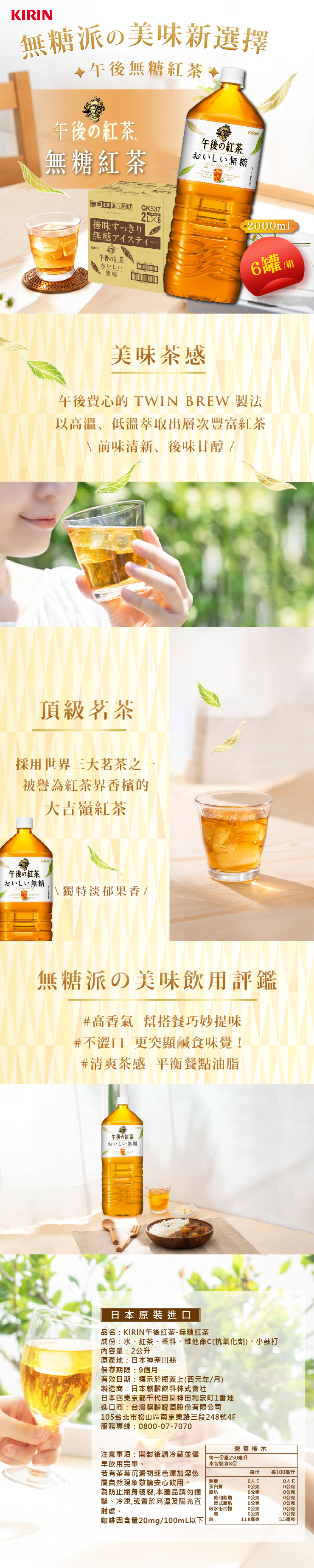 名稱:【KIRIN麒麟】午後紅茶-無糖紅茶2Lx6罐/箱