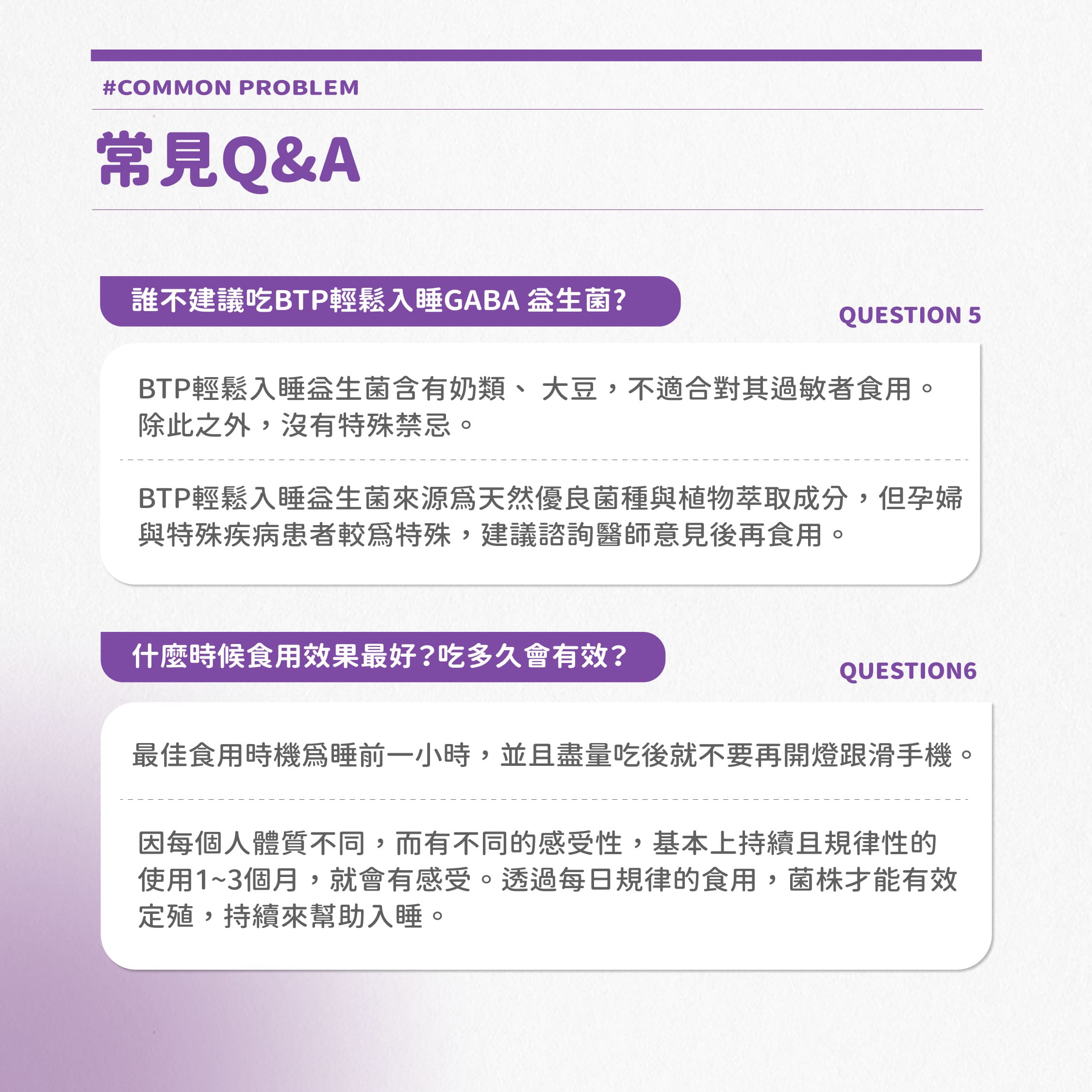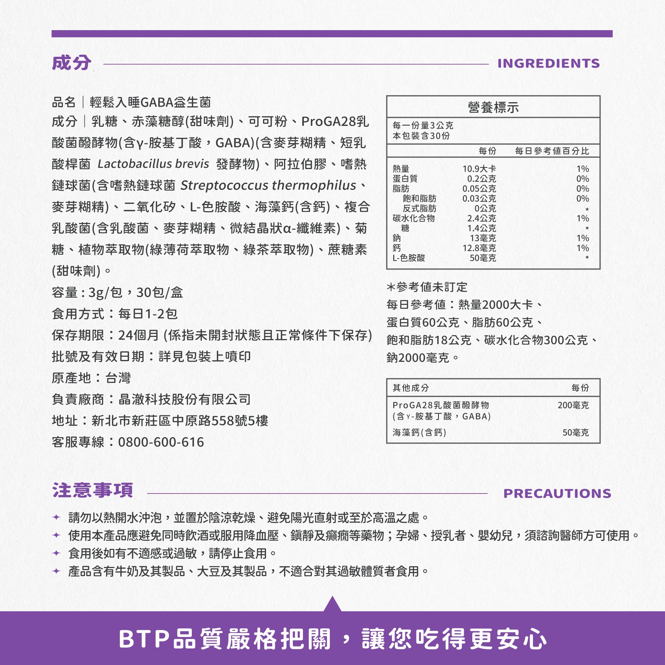 內容物成分:乳糖、赤藻糖醇(甜味劑)、可可粉、短乳酸桿菌發酵物ProGA28(含GABA)(含麥芽糊精、短乳酸桿菌Lactobacillus brevis發酵物)、阿拉伯膠、嗜熱鏈球菌(含嗜熱鏈球菌Streptococcus thermophilus、麥芽糊精)、二氧化矽、L-色胺酸、海藻鈣、複合乳酸菌(含乳酸菌、麥芽糊精、微結晶狀α-纖維素)、菊糖、植物萃取物(綠薄荷萃取物、綠茶萃取物)、蔗糖素(甜味劑)。