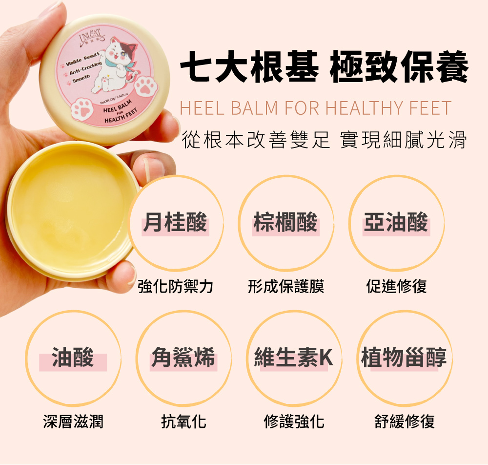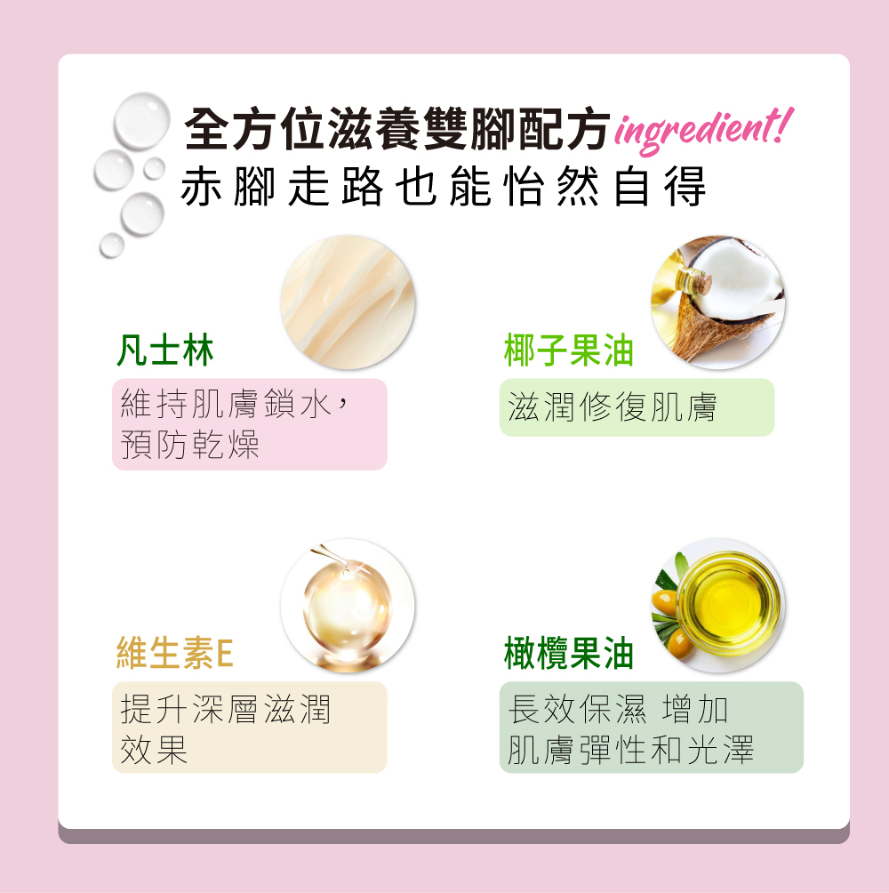 乾燥粗糙的雙足讓你煩惱不已? 無論怎麼保養,效果總是差強人意? 超保濕護足霜是你的最佳夥伴💪 呵護手腳不乾裂🦶❄️ 一抹化水不黏膩 讓你的雙足重獲柔嫩與光滑! 全方位滋養雙腳配方: 💙 凡士林 鎖住水分,預防乾燥,保持肌膚柔嫩。 💧 維生素E 滋潤修復,讓肌膚重現光滑細緻。 🥥椰子果油 深層滋潤,提升保濕效果,維持長效潤澤。 🌿 橄欖果油 長效保濕,增加肌膚彈性與光澤,呈現嫩滑肌膚。 成分亮點✨七⼤根基 極致保養 《月桂酸》:強化防禦力 《棕櫚酸》:形成保護膜 《亞油酸》:促進修復 《油酸》:深層滋潤 《角鯊烯》:抗氧化 《維生素K》:修護強化 《植物甾醇》:舒緩修復 從深層開始呵護雙足 告別乾燥⿔裂💢 讓您的雙⾜恢復柔軟彈性 重獲水潤光滑💦 超保濕護足霜 12g 使用方法: STEP1:使用清水清潔乾淨 STEP2:取適量均勻塗抹於雙足上 STEP3:輕柔按摩置雙足完全吸收,若是較粗糙乾燥處可以加強塗抹 STEP4:完成保養護理 適用: 乾裂、粗糙、厚實乾燥雙足 注意事項: 1.使用後如發癢、敏感等異常現象,請暫停使用 2.皮膚受損、濕疹、有傷口時,請勿使用 3.不慎入眼,請立即用水清洗 4.請勿食用本產品,遠離嬰幼兒可觸及處 保存方法:請放至陰涼乾燥處、勿直接太陽照射。 保存期限:3年 製造日期:標示於產品外包裝上 容量:12g/0.42fl.oz/盒 貨源: 公司貨