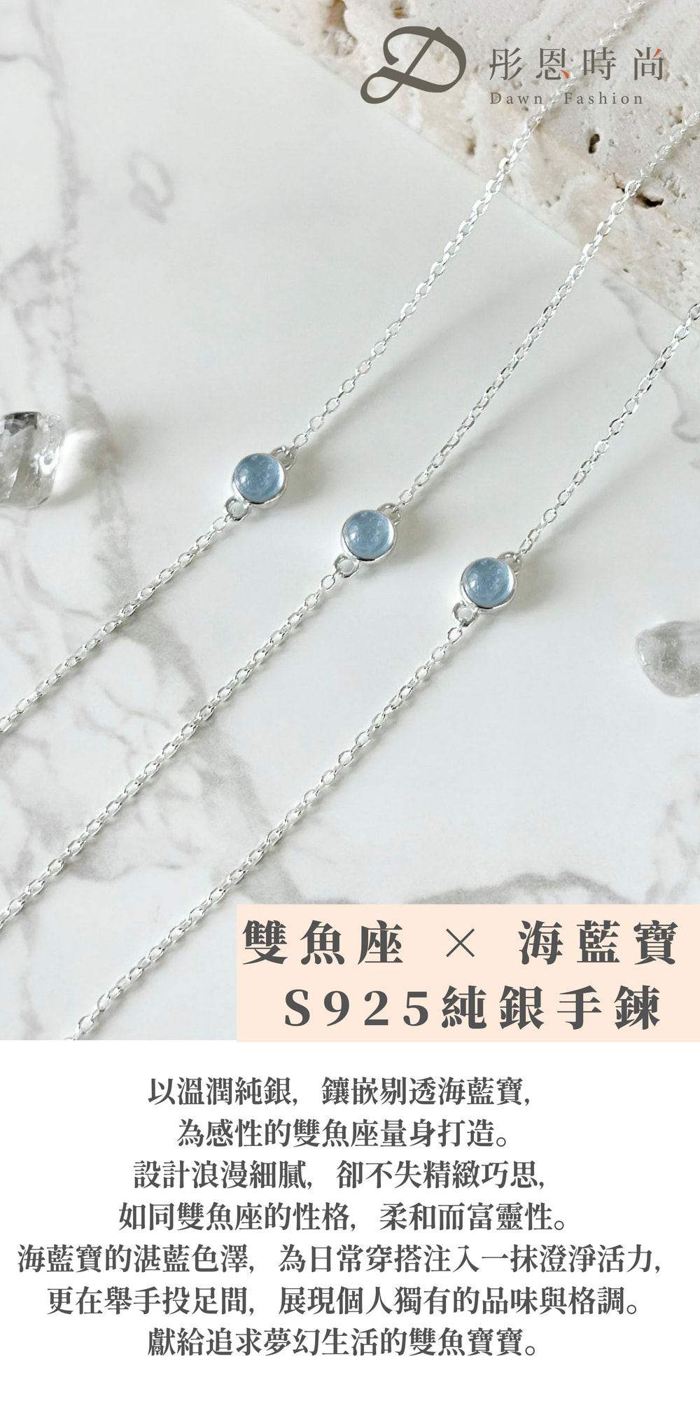 獻給追求浪漫夢幻的你,這款雙魚座海藍寶純銀手鍊,不只是柔美的日常飾品,更是靈魂療癒的象徵。