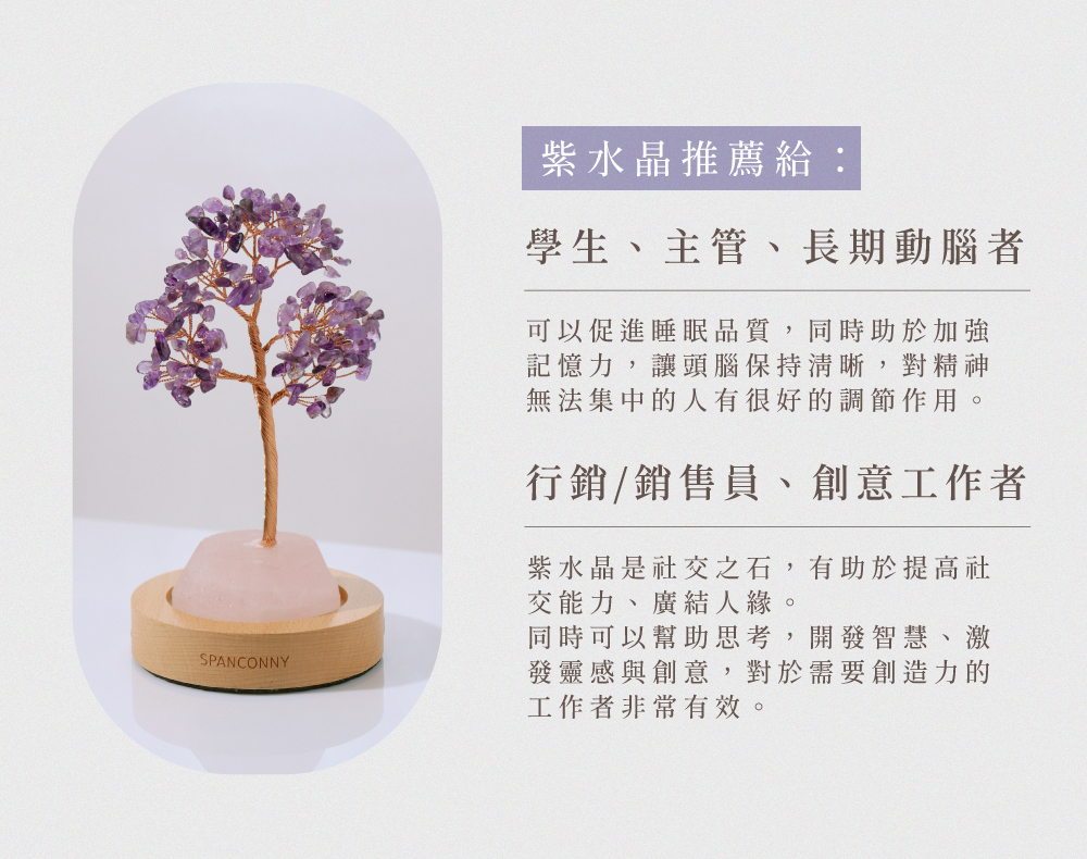【組合內容】◦ 水晶樹 (粉水晶/黃水晶/紫水晶)◦ 櫸木燈座◦ USB充電線◦ 精緻禮盒包裝