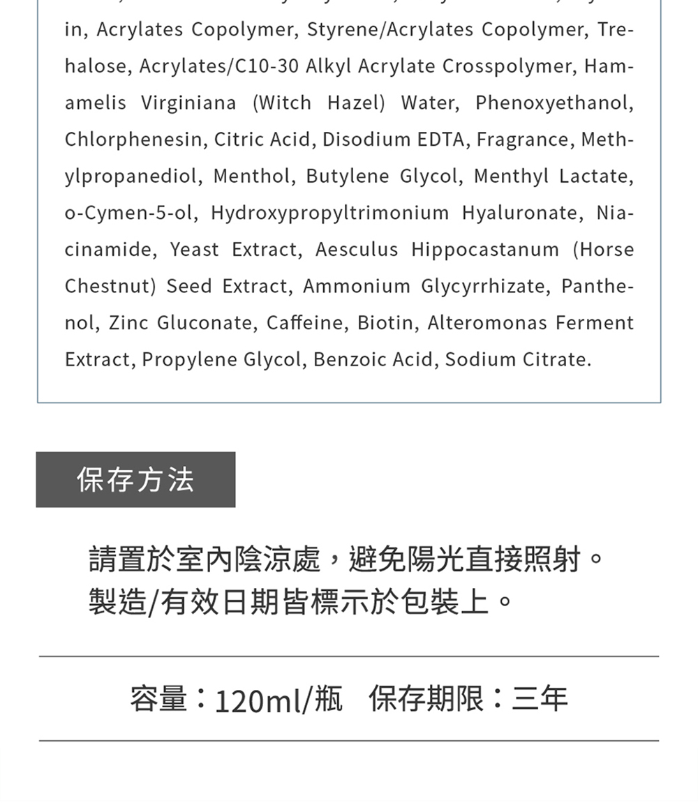 Water, Potassium Cocoyl Glycinate, Decyl Glucoside, Acrylates Copolymer, Glycerin, Trehalose, Propylene Glycol, Hamamelis Virginiana (Witch Hazel) Bark/Leaf/Twig Extract, Niacinamide, Yeast Extract, o-Cymen-5-ol, Aesculus Hippocastanum (Horse Chestnut) Seed Extract, Ammonium Glycyrrhizate, Methylpropanediol, Styrene/Acrylates Copolymer, Acrylates/C10-30 Alkyl Acrylate Crosspolymer, Butylene Glycol, Alteromonas Ferment Extract, Phenoxyethanol, Chlorphenesin, Citric Acid, Fragrance, Menthol, Menthyl Lactate, Disodium EDTA, Panthenol, Zinc Gluconate, Caffeine, Biotin, Sodium Citrate, Caprylyl Glycol, Hydroxypropyltrimonium Hyaluronate