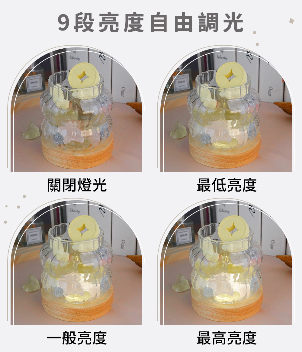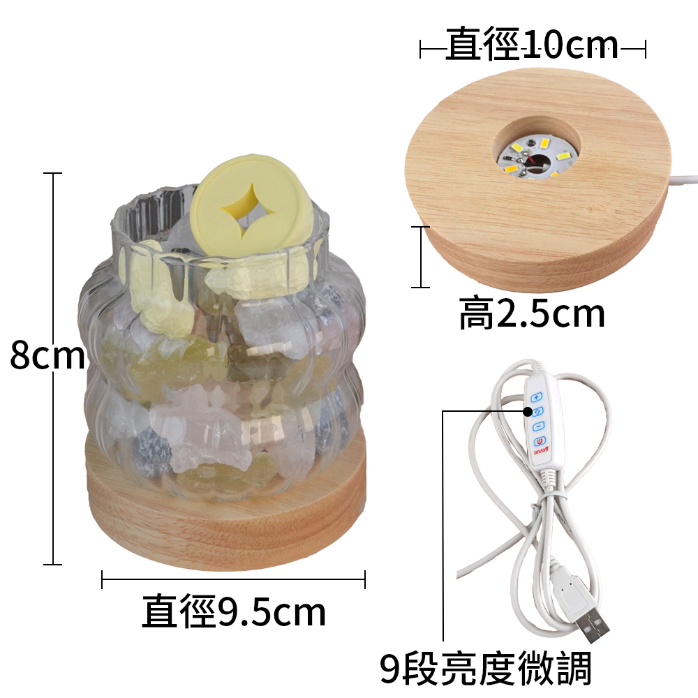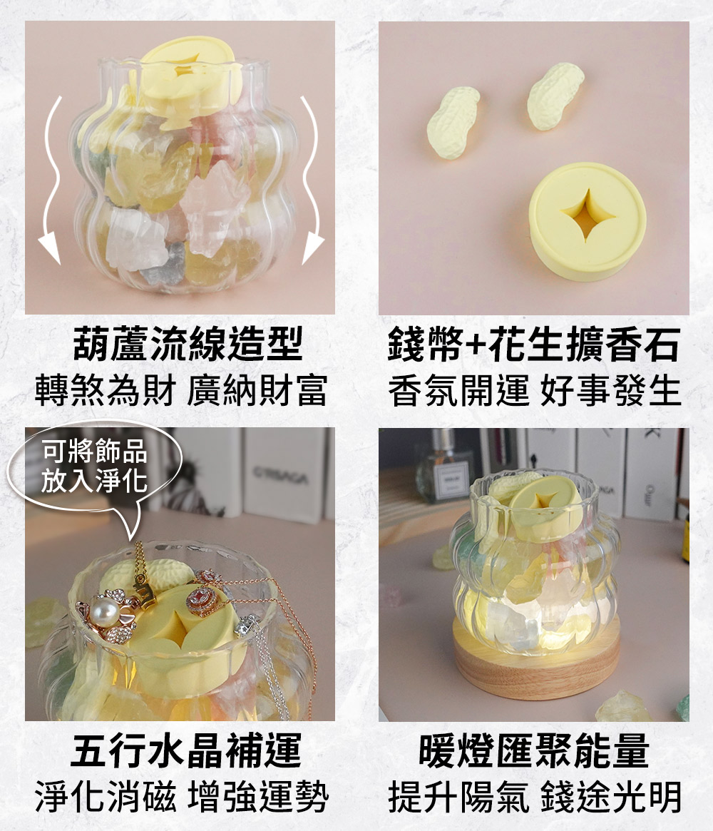 五行水晶再加上葫蘆造型外觀,一次擁有雙重淨化的功效,若出入磁場混亂地方,如醫院、夜遊、早出晚歸、外宿旅遊等,回家後可將開運飾品放入「五行晶礦財寶燈」中,淨化空間磁場並重新啟動好運。內附錢幣+好事花生擴香石,可視需求搭配精油芳香療法,香氛能使身心靈沉穩安定,得以釋放壓力。在忙碌的生活中為自己點亮一盞明燈,象徵貴人常伴左右,讓你錢途事半功倍、財源廣進!