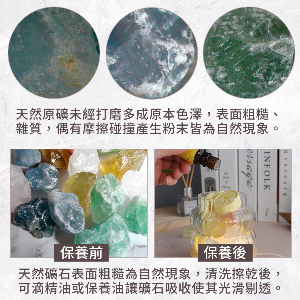 1. 天然原礦帶有表面粗糙、雜質、粉末皆為自然現象,可清洗擦乾後,用精油或保養油讓礦石吸收維持其光滑剔透。
