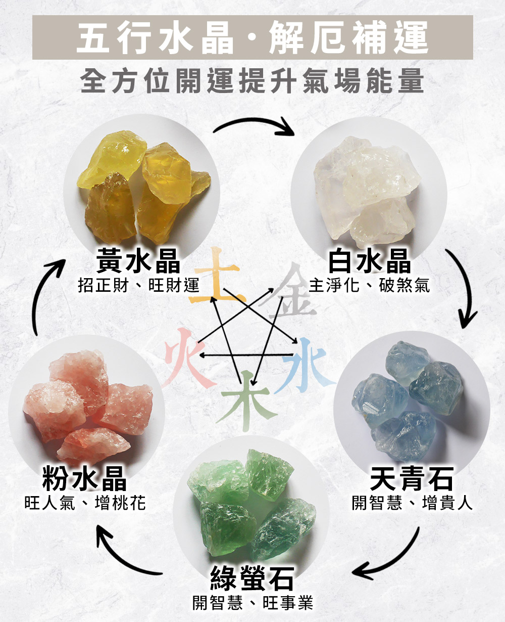 五行水晶原礦石x1包:材質:粉水晶、白水晶、黃水晶、綠螢石、天青石。重量:約450g。