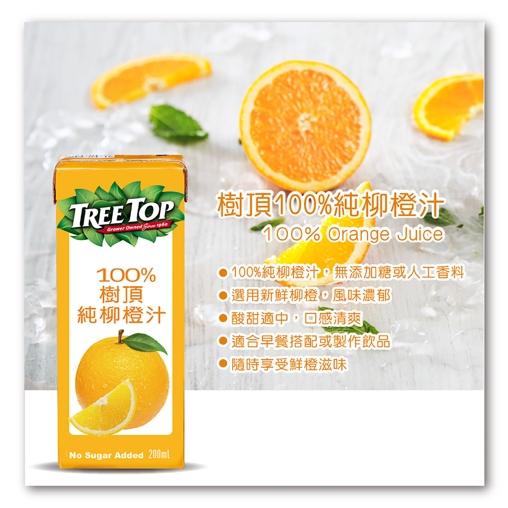 名稱:【TREE TOP 樹頂】100%純柳橙汁 200mlx1箱 (共24入)備註:本產線亦生產含芒果、花生、芝麻、牛奶、蛋、堅果類、含麩質之穀物及大豆製品
