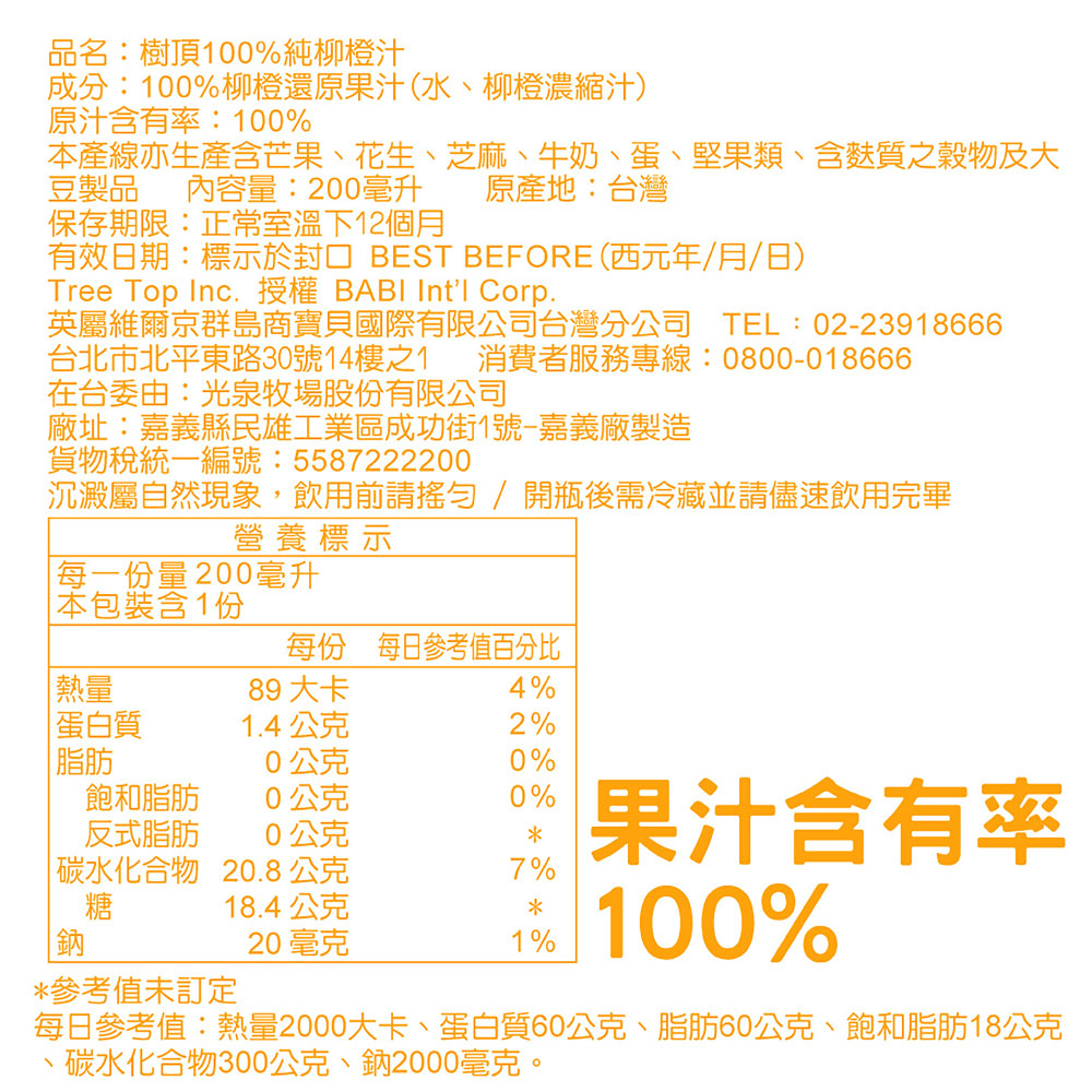 1.商品組合/規格:樹頂100%純柳橙汁200ml 24入2.商品品名:樹頂100%純柳橙汁3.商品重(容)量:200ml4.內容物成分(如含有豬、牛成分請加註國別):100%柳橙還原果汁(水、柳橙濃縮汁)5.食品添加物名稱:詳見內容物成分6.原產地(國):台灣7.製造廠商或國內負責廠商名稱:英屬維爾京群島寶貝有限公司台灣分公司8.製造廠商或國內負責廠商地址:北市北平東路30號14F之一9.製造廠商或國內負責廠商電話:080001866610.以消費者收受日算起,至少距有效日期前?日以上:9111.食品業者登錄字號:A-116837949-00000512.投保產品責任險字號:70-103-05747085-0001備註欄:本產線亦生產含芒果、花生、芝麻、牛奶、蛋、堅果類、含麩質之穀物及大豆製品
