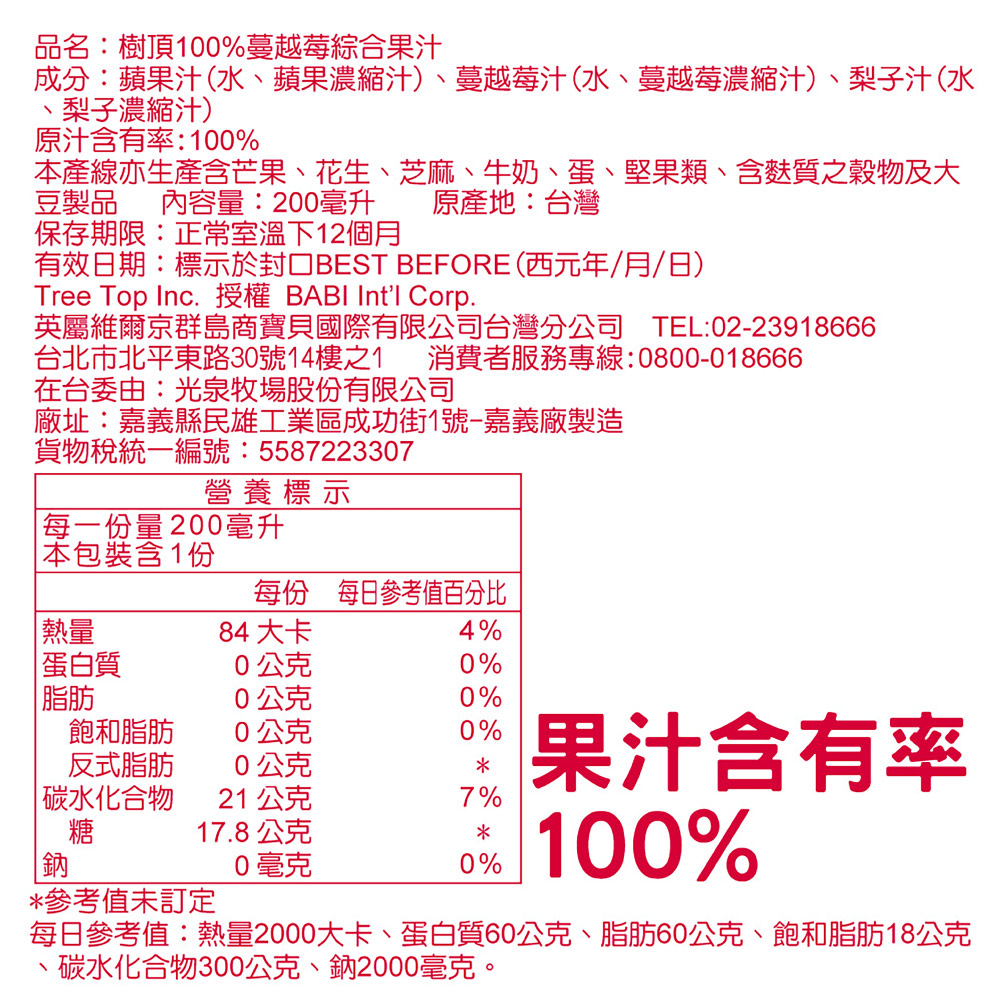 名稱:【TREE TOP 樹頂】100%嚴選蔓越莓綜合果汁 200mlx1箱 (共24入)備註:本產線亦生產含芒果、花生、芝麻、牛奶、蛋、堅果類、含麩質之穀物及大豆製品