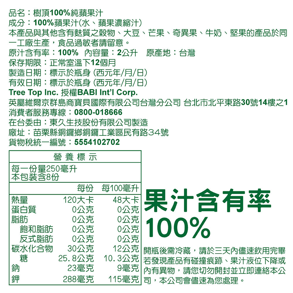1.商品組合/規格:蘋果汁_2L_寶特瓶x62.商品品名:樹頂100%蘋果汁_2L_寶特瓶x63.商品重(容)量:2L*64.內容物成分(如含有豬、牛成分請加註國別):100%蘋果還原果汁(水、蘋果濃縮汁)5.食品添加物名稱:詳見內容物成分6.原產地(國):台灣7.製造廠商或國內負責廠商名稱:英屬維爾京群島寶貝有限公司台灣分公司8.製造廠商或國內負責廠商地址:北市北平東路30號14F之一9.製造廠商或國內負責廠商電話:080001866610.以消費者收受日算起,至少距有效日期前?日以上:9111.食品業者登錄字號:A-116837949-00000512.投保產品責任險字號:70-103-05747085-0001備註欄:本產線亦生產含芒果、花生、芝麻、牛奶、蛋、堅果類、含麩質之穀物及大豆製品