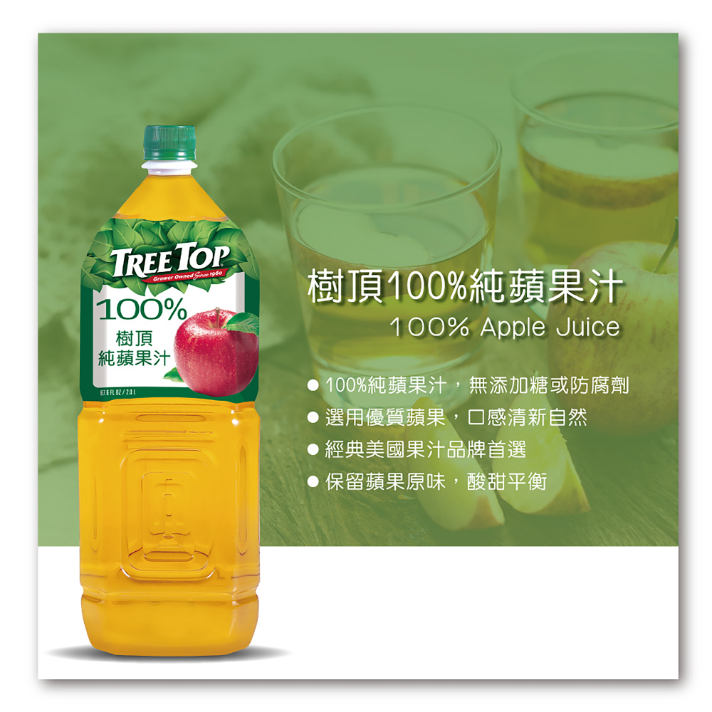 名稱:【TREE TOP 樹頂】100%純蘋果汁 2Lx1箱 (共6入)備註:本產線亦生產含芒果、花生、芝麻、牛奶、蛋、堅果類、含麩質之穀物及大豆製品