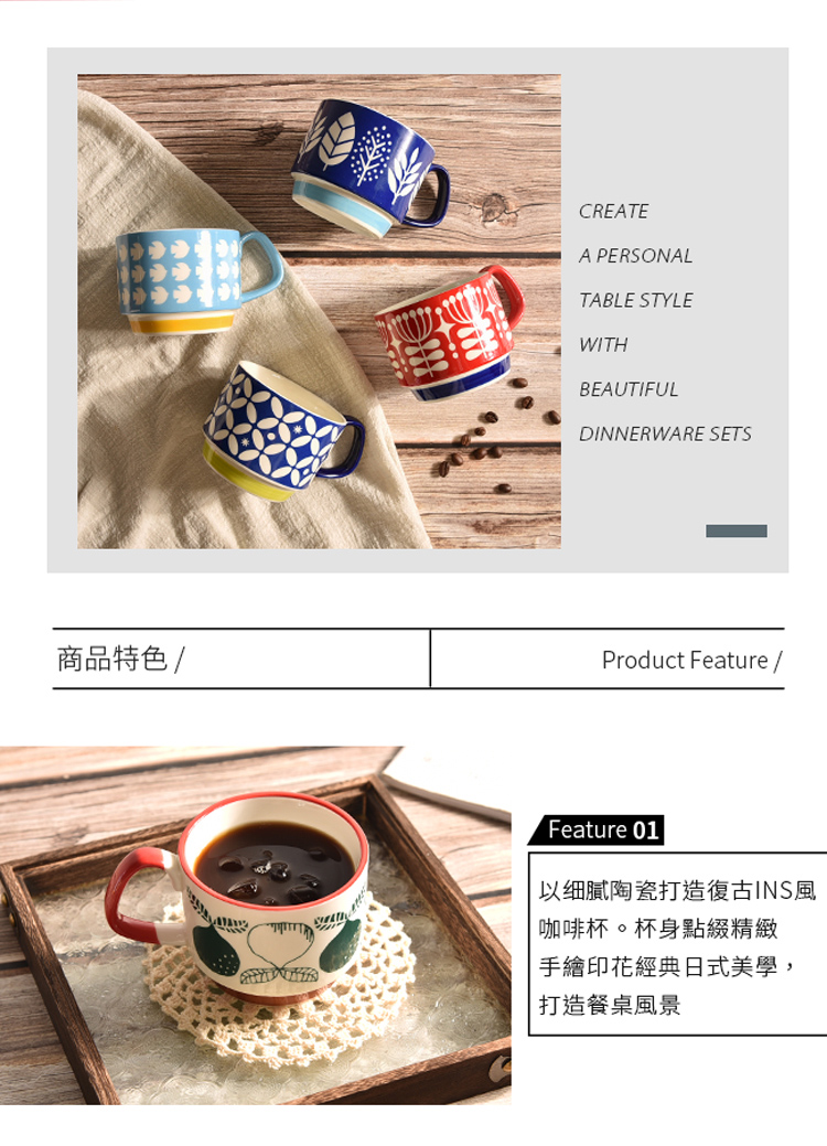 ★讓喝咖啡的平凡時刻,也能閃閃發光* 以细膩陶瓷打造復古ins風咖啡杯。杯身點綴精緻手繪印花經典日式美學,打造餐桌風景* 聰明可堆疊設計,小空間的優雅解法獨特階梯式杯底結構,讓杯子能穩固疊放3-4個,垂直收納不佔空間。* 高溫陶瓷燒製-瓷資厚實細膩質感好* 杯口圓潤設計-每一處細節都匠心打磨,邊緣光滑圓潤厚度適中* 造型別緻加粗把手設計-手感舒適,端拿不易燙手* 底部不上釉設計-穩固防滑杯底* 用不同色彩構築滿滿的生活儀式感