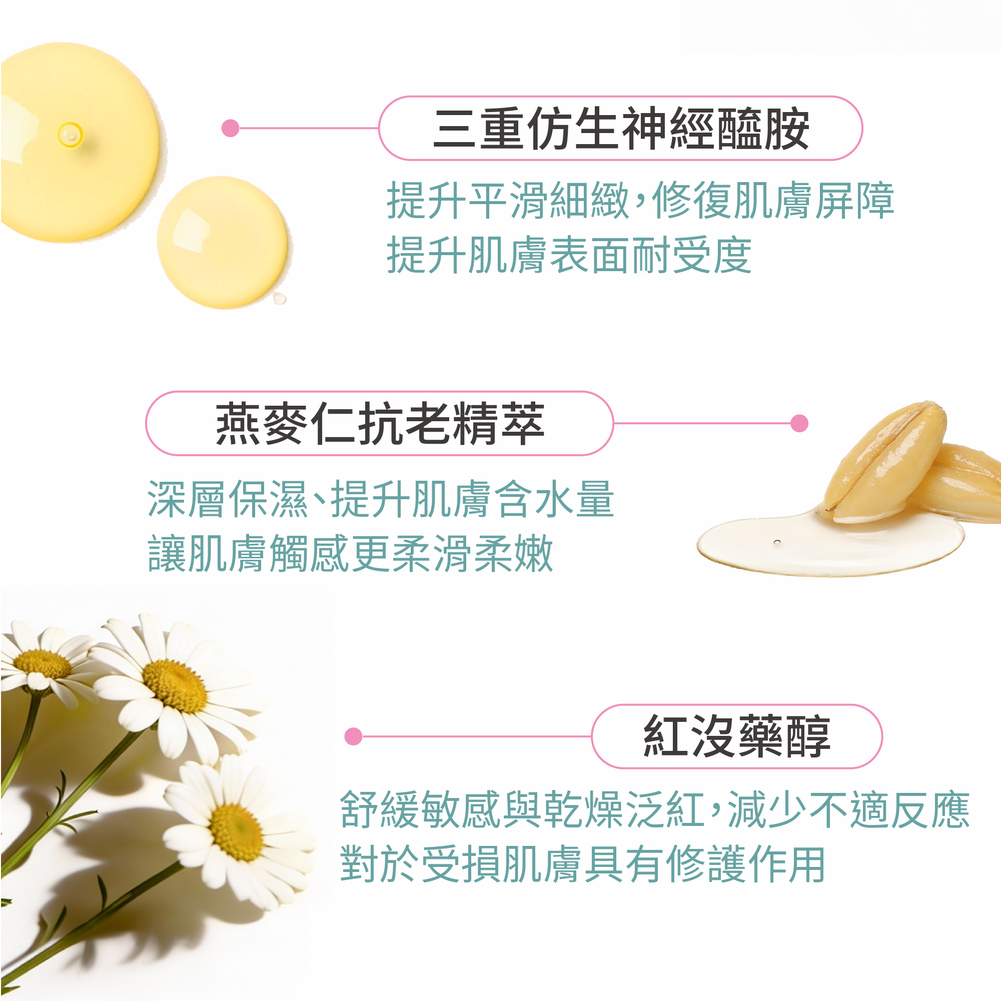 沒藥醇(Bisabolol)是一種常見於洋甘菊中的天然舒緩植萃,能增加皮膚防禦力、抗菌能力,可延緩肌膚老化。
