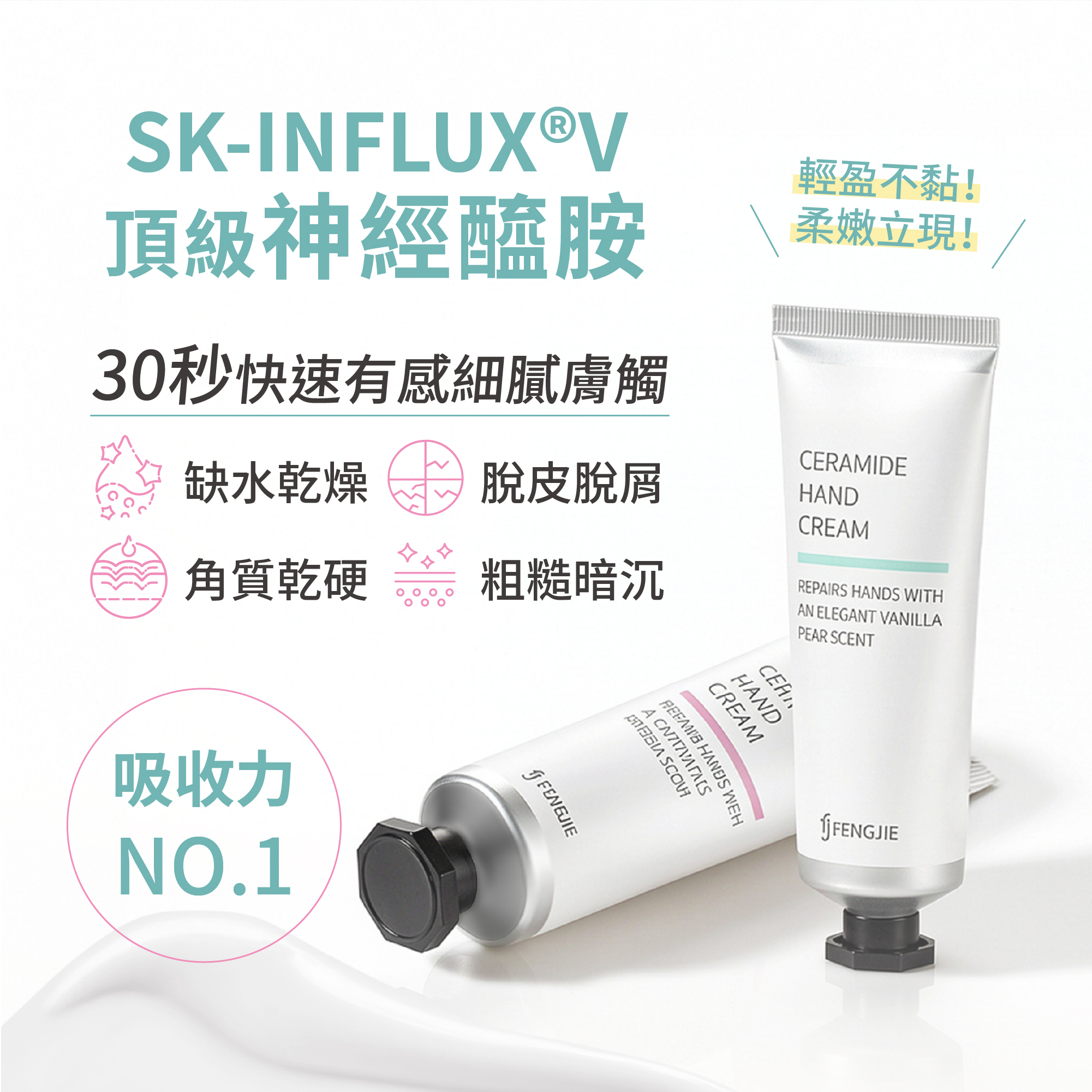 豐傑的護手霜是添加高濃度神經醯胺沒錯喔!我們採用專利SK-INFLUX®,同時含有3種不同類型的神經醯胺,能精準補足受損屏障,讓雙手重拾細緻觸感。