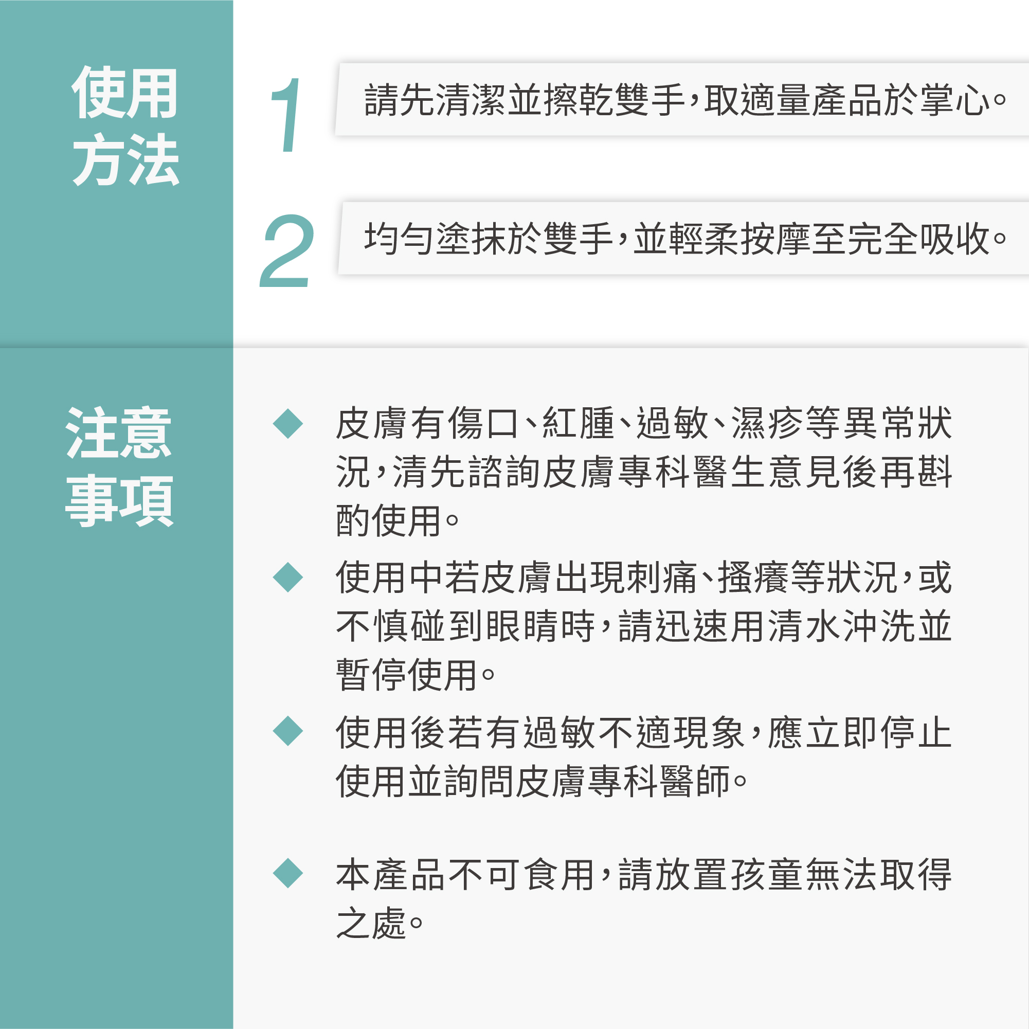 可於洗手後,直接擠在手背上,平均擦勻在手部肌膚、關節、指緣處。若手部已乾裂受損,可在睡前厚擦並配戴手套,更能深層修護手部肌膚。
