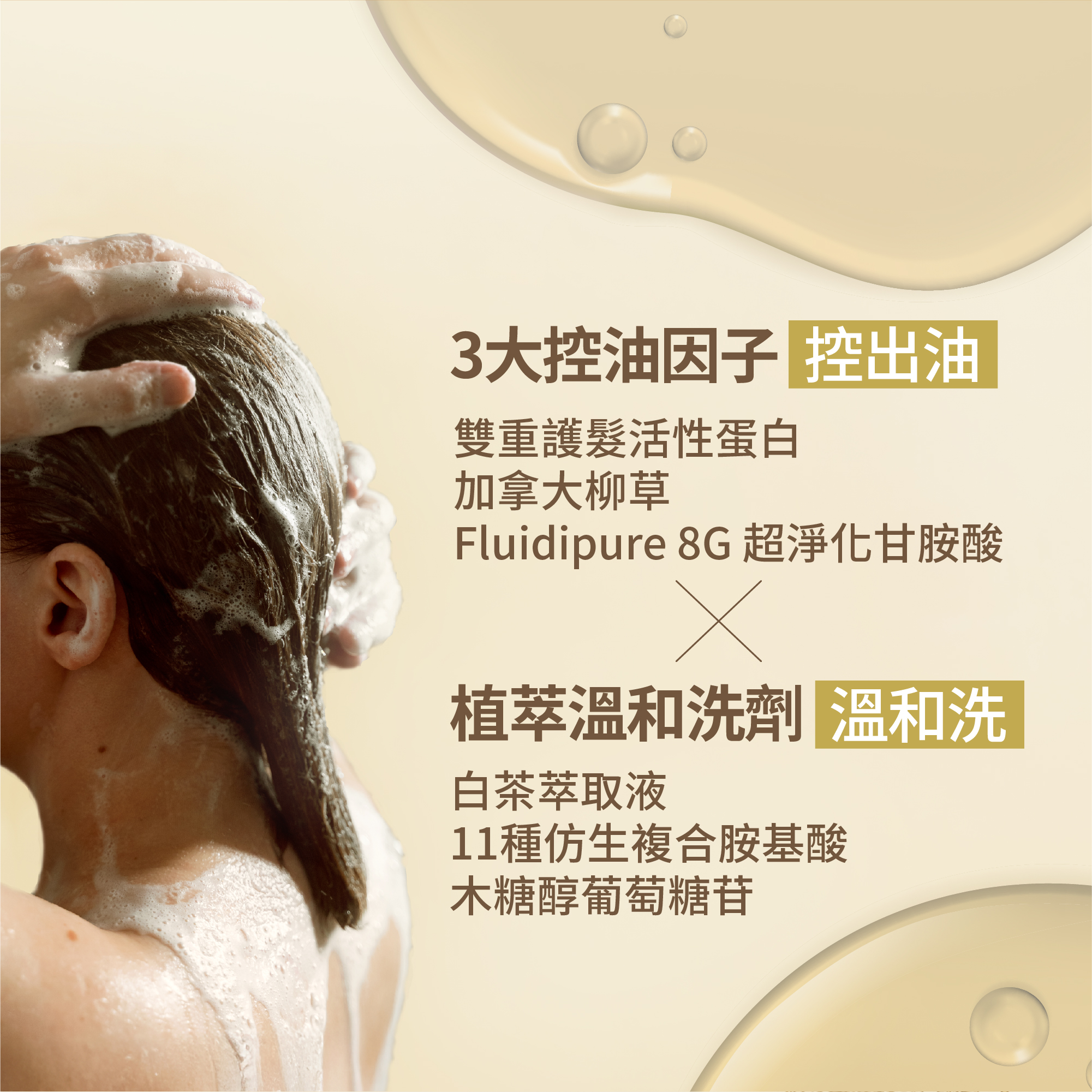 有!我們有添加Fluidipure 8G 超淨化甘胺酸與加拿大柳草,可以幫助頭皮油水平衡,抑制過多的油脂分泌!