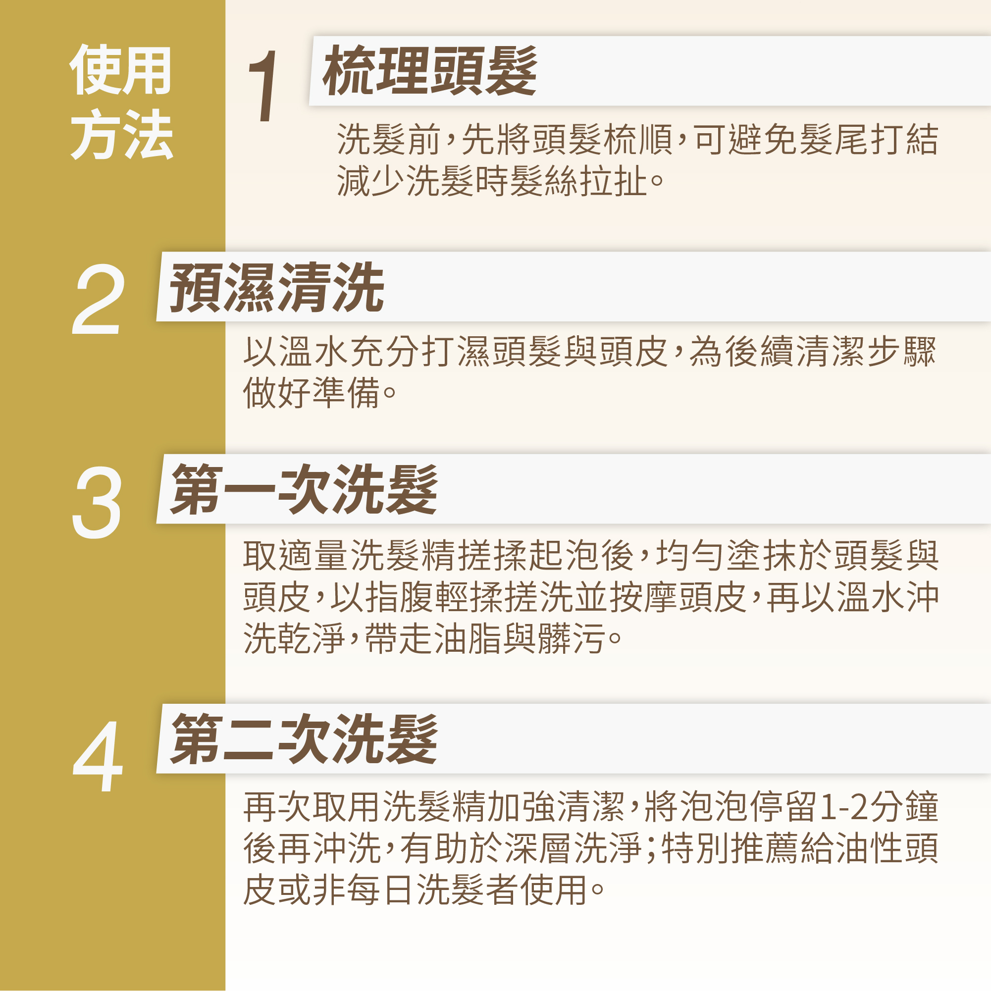以指腹輕柔按摩頭皮,並將泡泡停留1-2分鐘即可沖洗。