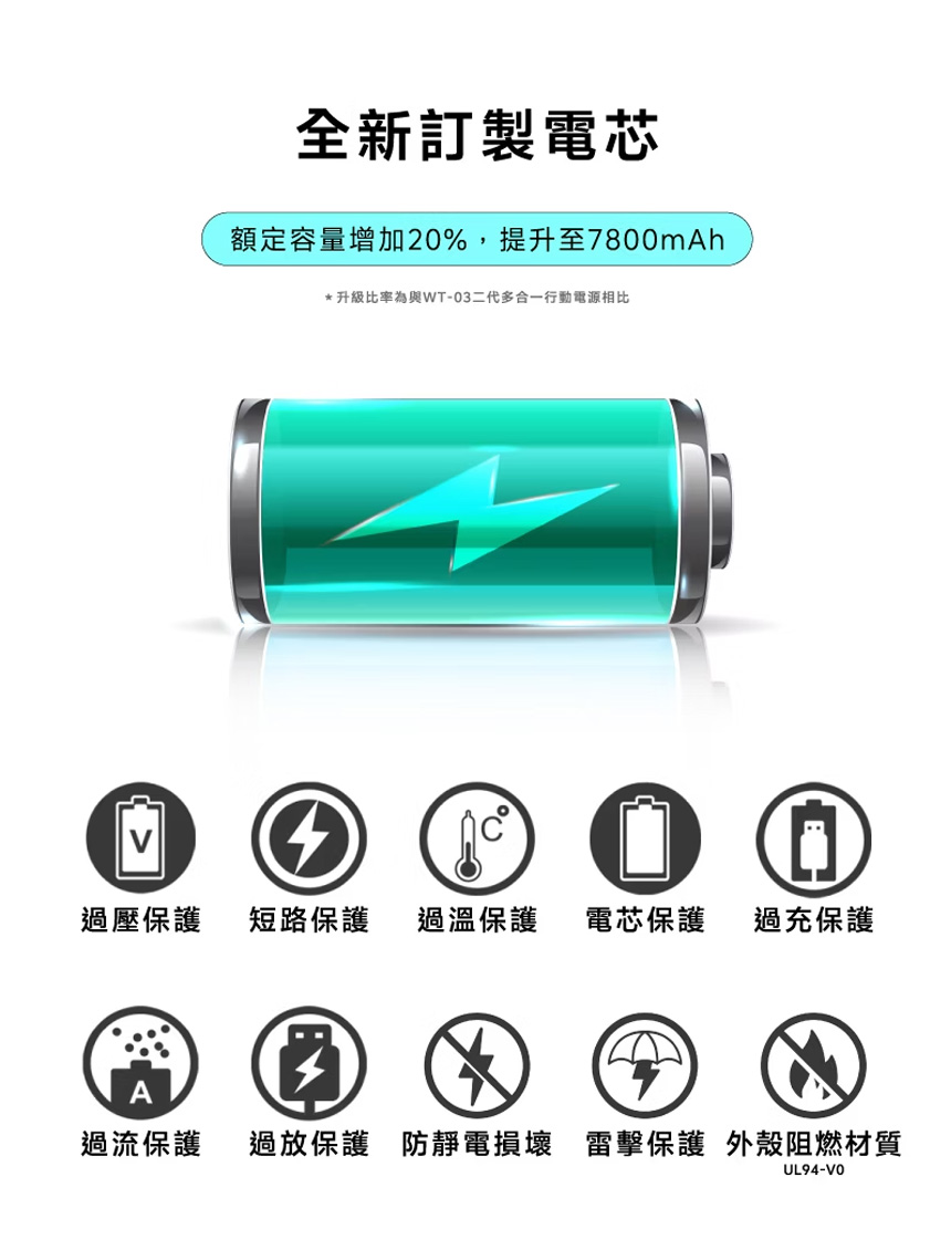 產品名稱:全功能無線充電行動電源產品型號:WT-08PTC電芯種類/總容量:高容量理聚合物電芯;3.85V/11200mAh/43.12Wh额定容量(USB-A):5V/7800mAh ; 9V/4250mAh ; 12V/3050mAh额定容量(USB-C):5V/7800mAh ; 9V/4250mAh ; 12V/3050mAh額定容量(Lightning/USB-C線):5V/7800mAh ; 9V/4250mAh ; 12V/3050mAhAC模式輸入:AC 100-240V , 50/60Hz 0.5A maxAC模式輸出(USB-C):5V-2A(10W)AC模式輸出(USB-A):5V-2A(10W)AC模式輸出(USB-C1線):5V-2A(10W)AC模式輸出(USB-C2線):5V-2A(10W)AC模式輸出(無線充電):5V-5W ; (Watch) : 5V-2WDC模式輸入(USB-C):5V-3A ; 9V-2A ; 12V-1.5A (18W max)DC模式輸出(USB-A):5V-3A ; 9V-2.2A ; 12V-1.65ADC模式輸出(USB-C):5V-3A ; 9V-2A;12V-1.65ADC模式輸出(USB-C1線):5V-3A ; 9V-2.2A ; 12V-1.65ADC模式輸出(USB-C2線):5V-3A;9V-2.2A;12V-1.65ADC模式輸出(無線充電):5V-5W ; 9V-7.5W ; 10W ; 15W ; (Watch) : 5V-2W同時充放電:USB-C輸入充電5V/3A時同時充放電:USB-A+USB-C1線+USB-C2線+無線充電輸出:5V/1.5A+5WAC模式輸出:5V-2A (10W max)尺寸:87x87x33(mm)重量:285gBSMI號碼:R33G35NCC號碼:CCAP25LP0591T7