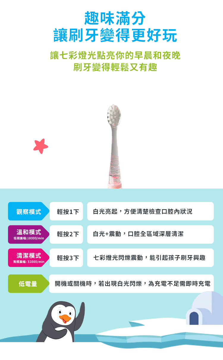 .3種潔牙模式觀察模式:輕按1下,閃亮白光,能清楚檢查口腔內部細節。溫和模式:輕按2下,白光震動,溫和聲波,不傷寶寶牙齦、牙齒。清潔模式:輕按3下,七彩閃爍,高頻震動,能引起孩子刷牙興趣。