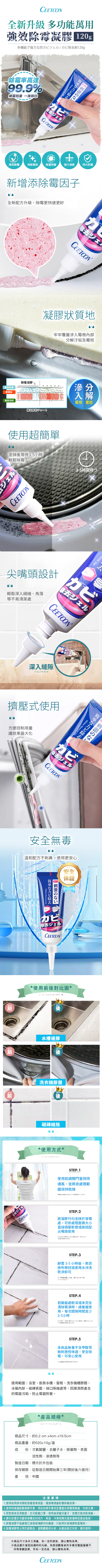 ●商品使用方式1. 使用前請打開門窗通風,並保持處理面乾燥乾淨,旋轉蓋子擠出商品。2. 將商品均勻地塗抹於發霉處,清理大面積黴菌時直接擠壓管體進行塗抹即可,清理窗框、馬桶、水池等接縫處的黴菌時,可換上尖頭蓋進行塗抹。3. 靜置3-5小時後,用濕布擦拭或者用水沖洗乾淨即可 。4. 若黴菌處較深或者未完全清除黴漬時,請重複使用,每次尖隔最少3-5小時。5. 商品無毒不含甲醛等,無刺激性味道,安全除黴。