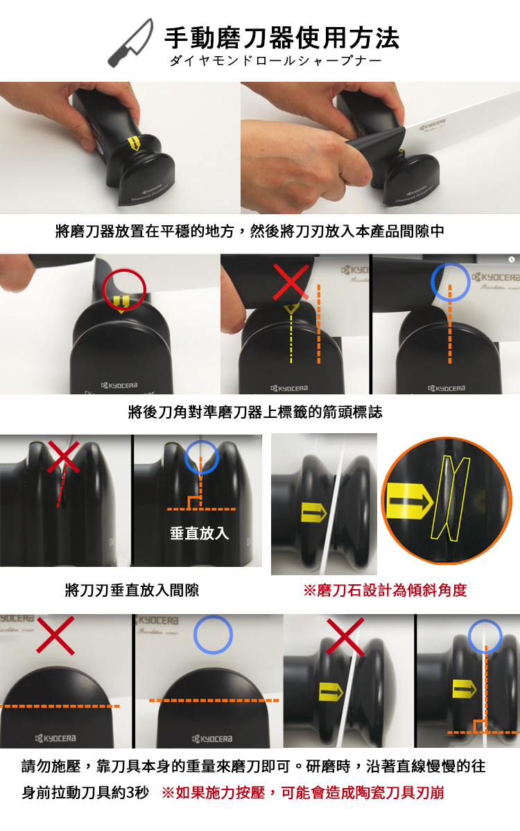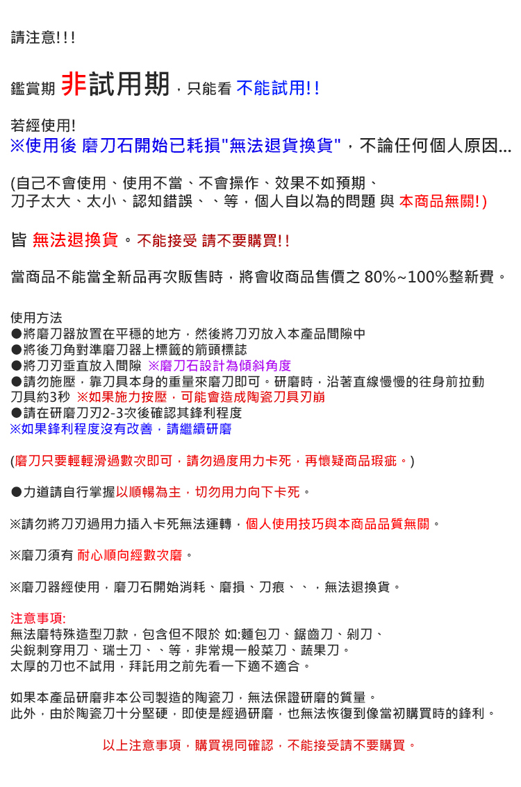 ※請勿研磨刀刃較厚的刀,生魚片刀等單刀刃,以及麵包刀及特殊菜刀、剁刀。※此商品不提供測試試用不開放體驗。若不能接受請勿購買,拆封後無法退貨!
