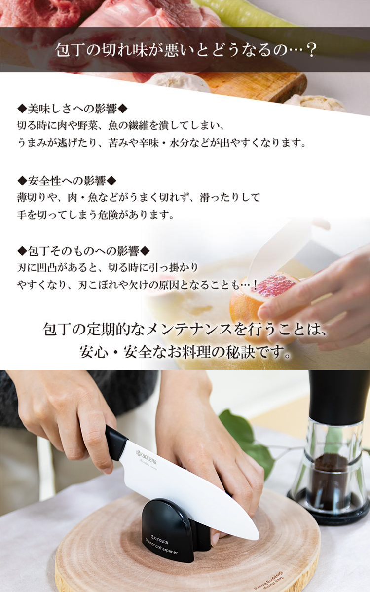 “京瓷 手動金剛鑽滾輪磨刀器 DS20S”是可以研磨各種材質菜刀的手動金剛鑽滾輪磨刀器。無論是不鏽鋼、鋼、陶瓷或是鈦金屬的菜刀,都可以通過手動與金剛鑽磁石迅速、鋒利、簡單的完成研磨。即使是很難研磨的陶瓷刀也可以在家中簡單的完成研磨。
