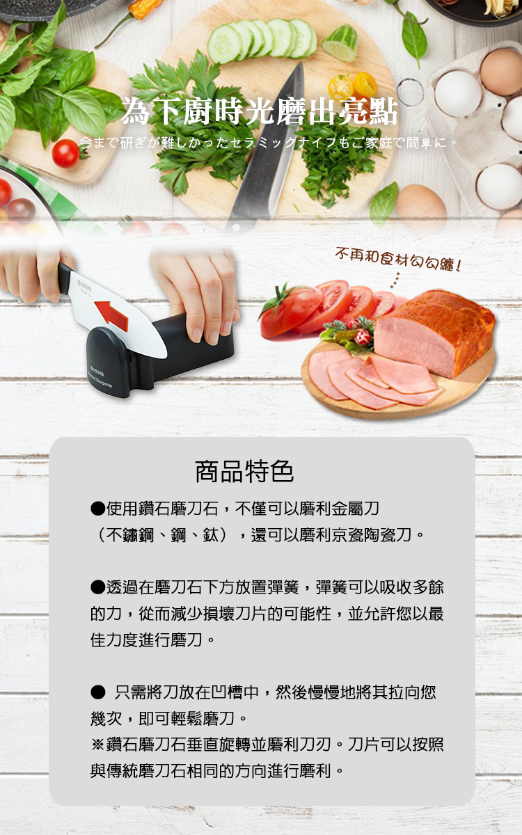 ●日本暢銷 原裝進口●可通用 四種材質(陶瓷、不鏽鋼、鋼、鈦)●手動更直覺,快速方便●輕鬆修復刀刃●使用方便 好省力