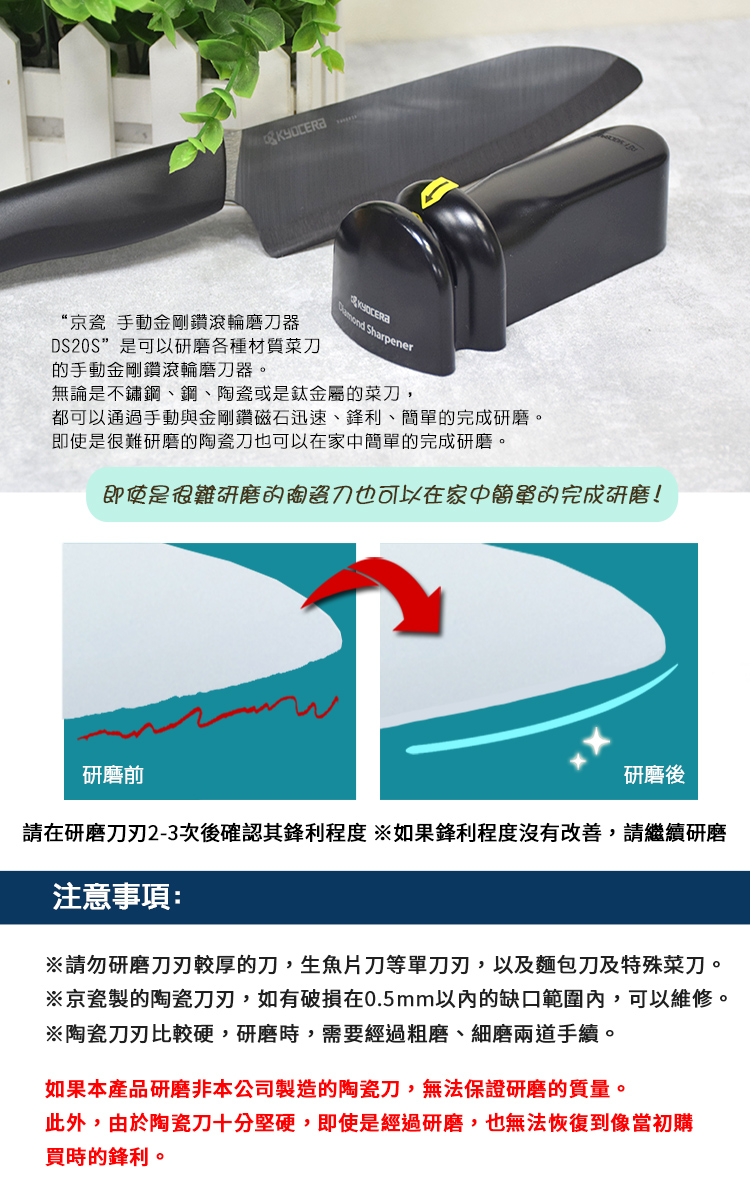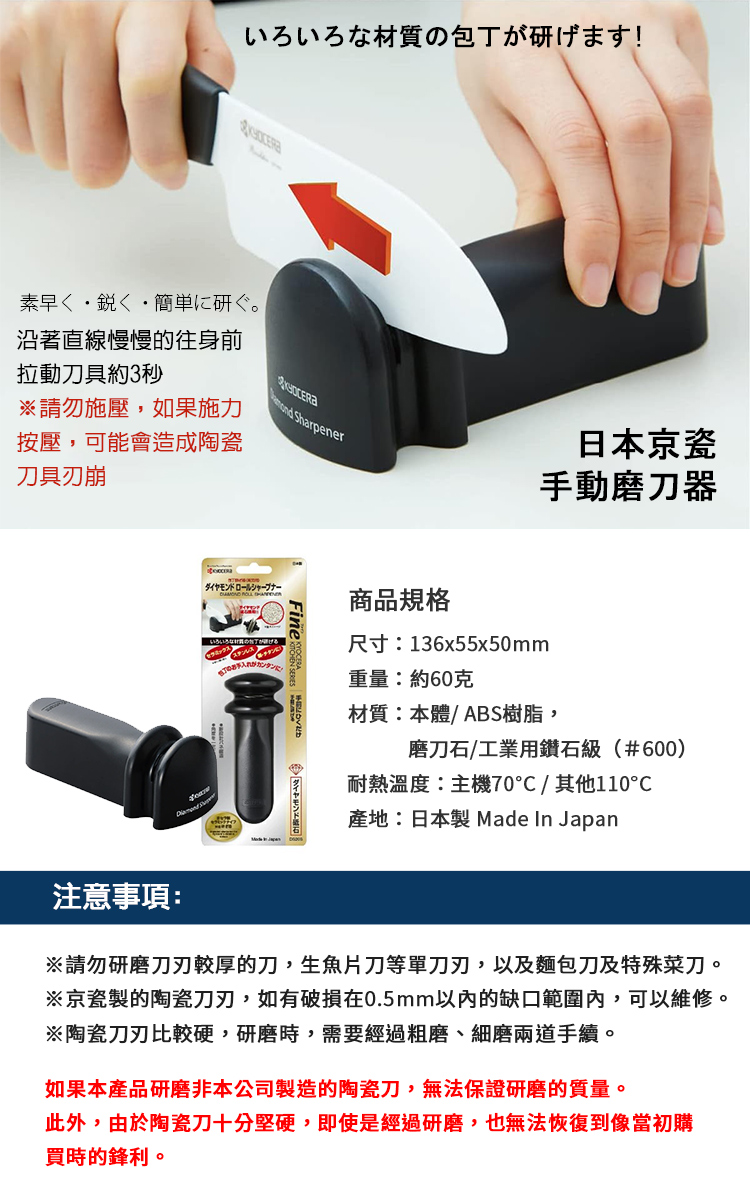 ●使用鑽石磨刀石,不僅可以磨利金屬刀(不銹鋼、鋼、鈦),還可以磨利京瓷陶瓷刀。