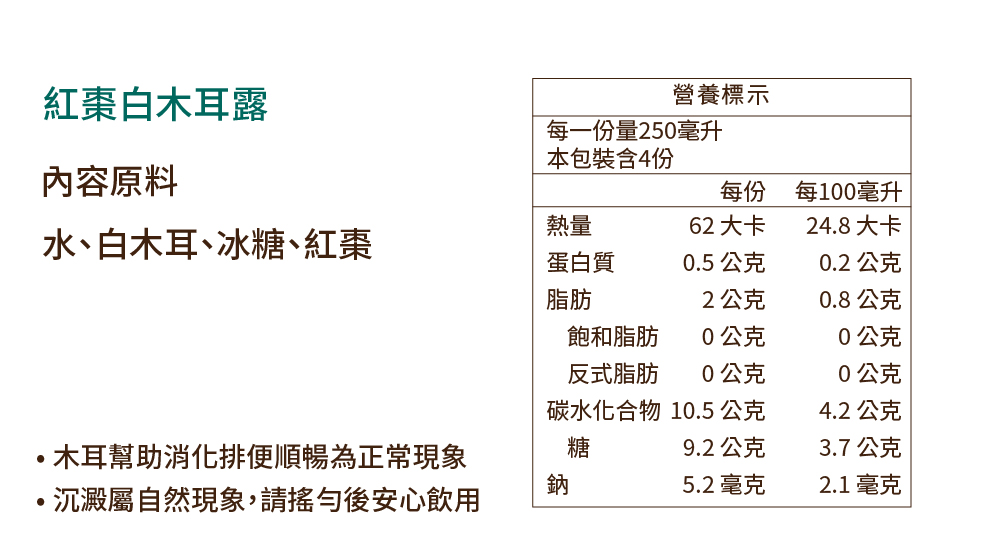內容量:1000ml產品內容物:雪梨白木耳露:水、白木耳、雪梨、冰糖蜂蜜檸檬白木耳露:水、白木耳、蜂蜜、檸檬汁、冰糖、珊瑚草紅棗白木耳露(無加糖):水、白木耳、紅棗紅棗白木耳露(銀耳朵朵版):水、白木耳、冰糖、紅棗