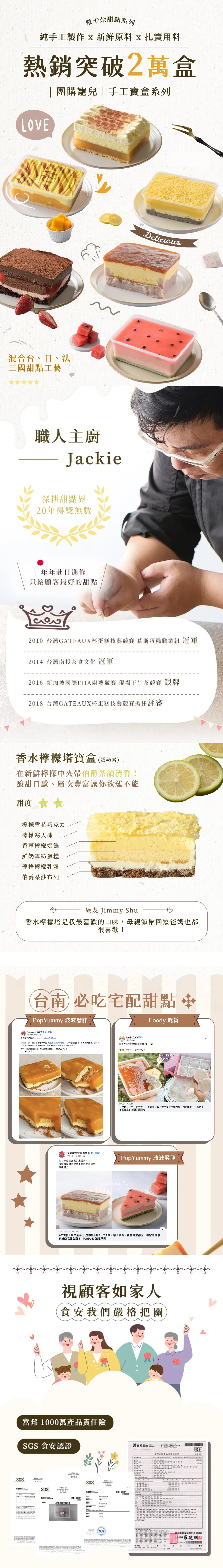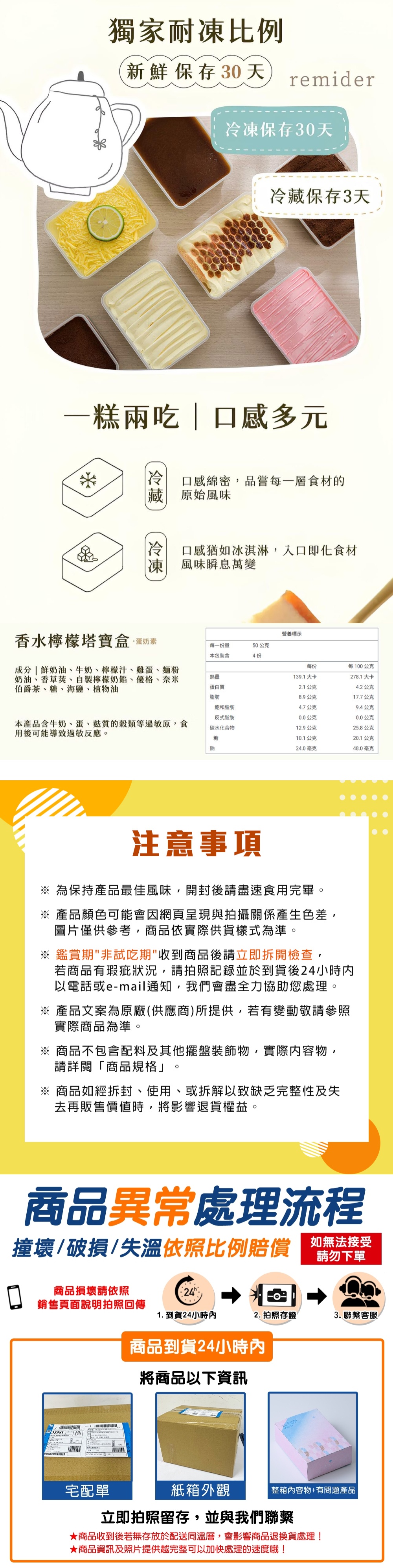 商品內容商品組合/規格:200g/盒x2盒商品品名:香水檸檬塔小寶盒商品重(容)量:200g±20g/盒x2盒內容物成分(如含有豬、牛成分請加註國別):鮮奶油、牛奶、檸檬汁、雞蛋、麵粉、奶油、香草莢、自製檸檬奶餡、優格、奈米伯爵茶、糖、海鹽、植物油食品添加物名稱:如成分所示過敏原資訊:本產品含牛奶、蛋、麩質的穀類及其製品,不適合對其過敏體質者食用。原產地(國):台灣保存期限:冷凍保存30天、冷藏保存3天(勿來回退凍,影響口感),建議收到可先冷凍,要吃的時候在退至冷藏食用方式:凍凍吃:稍微解凍到可以挖,享受冰淇淋蛋糕口感。綿綿吃:冷藏室退凍約3~8小時(冰箱冷度影響退凍時間),建議前一晚放冷藏,隔日享用綿密口感。建議使用湯匙多個層次一起挖起食用,主廚設計甜度平衡是多層次一起搭配最棒了!冷凍保存請在-18℃條件下保存,才能確保蛋糕口感不會老化變質,建議放置冷藏後三天內食用完畢。