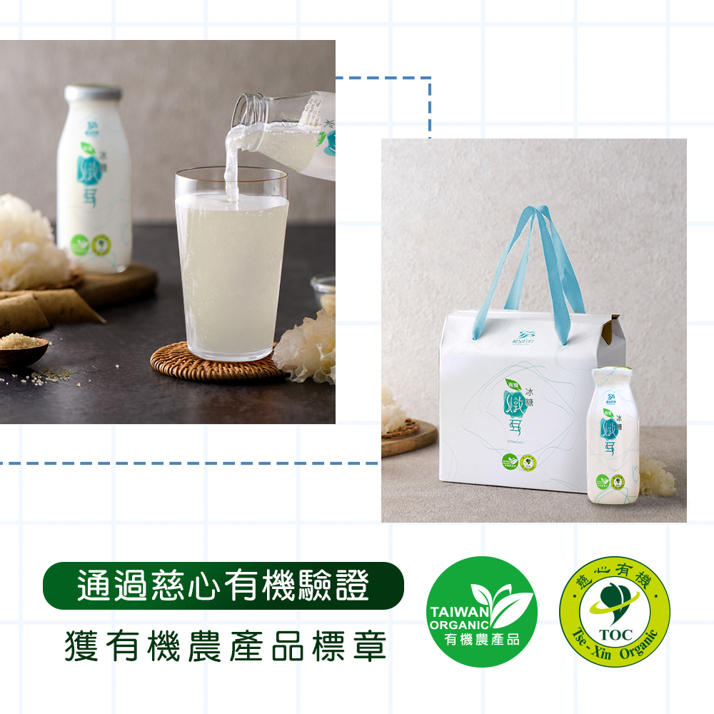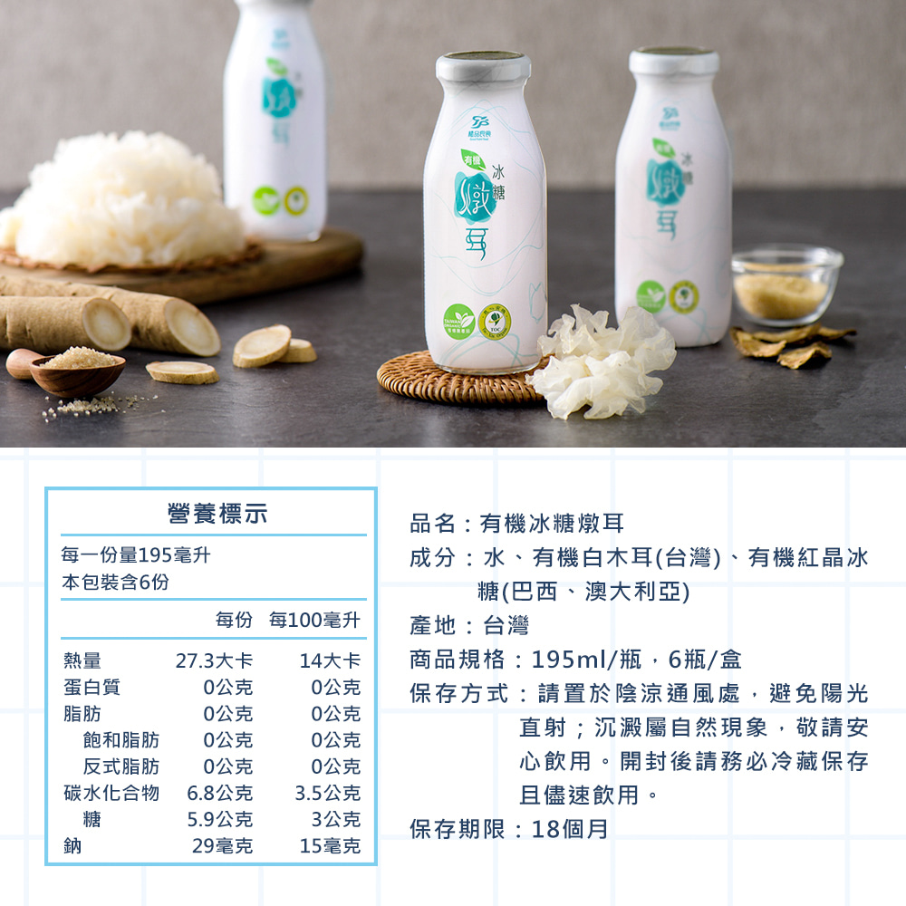 品名:有機冰糖燉耳規格:195ml/瓶,6瓶/盒內容物 : 水、有機白木耳(台灣)、有機紅晶冰糖(巴西、澳大利亞)