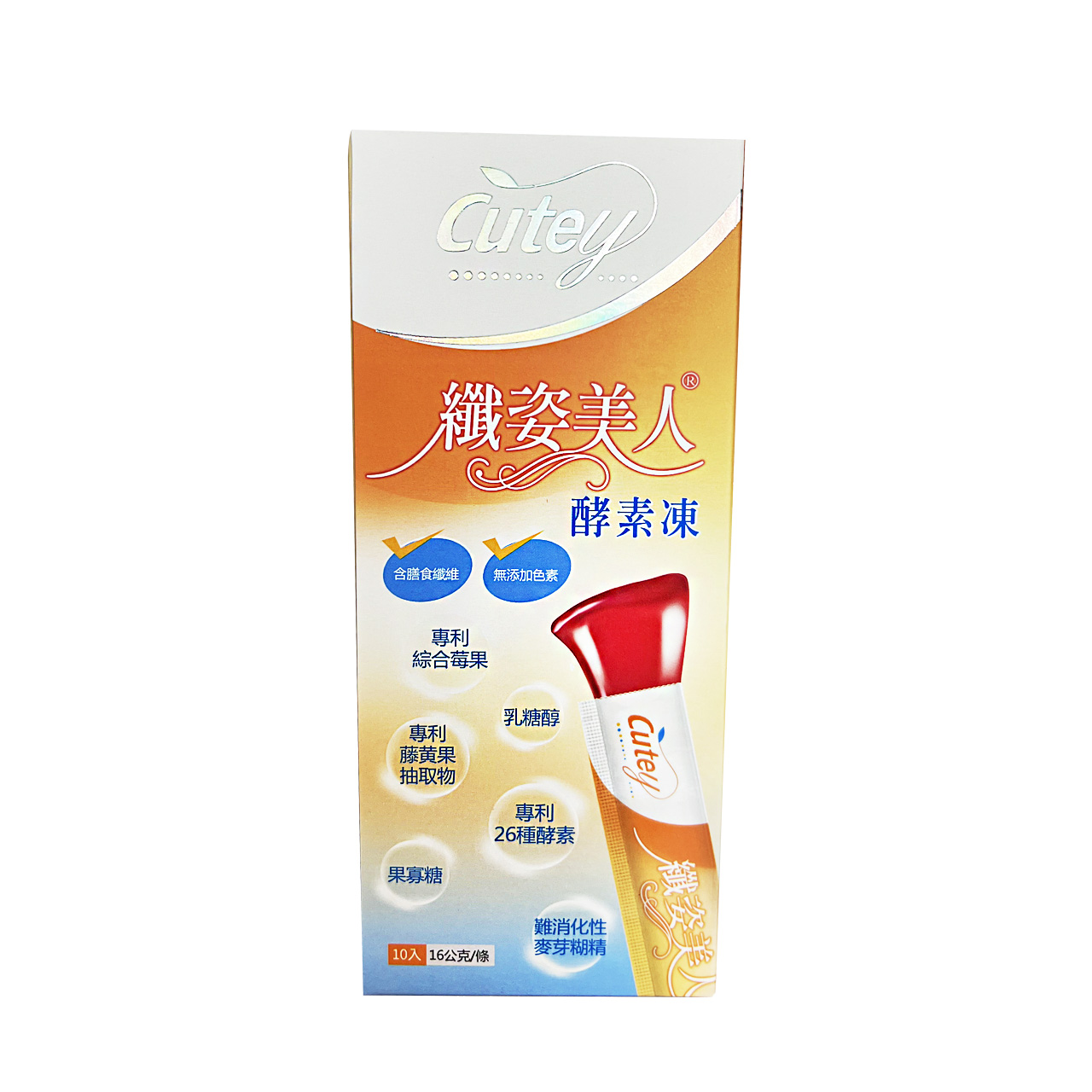 商品內容名稱:【Cutey】纖姿美人酵素凍 (16g/條, 10條/盒)貨號:14DGP026產品優勢:⊙每條2g 膳食纖維(高纖--排便順暢) ⊙台灣SVF-26種專利綜合蔬果酵素(單位分子小,無農藥,SOD LIKE,糖類檢驗報告)(幫助腸道蠕動 )⊙美國GRAS--2項專利藤黃果(SuperCitrimax) (幫助消化) ⊙Fibersol-2難消化性麥芽糊精(美國&日本專利)(幫助維持消化道機能)⊙韓國專利七仙綜合莓果(黑醋栗,藍莓,蔓越莓,巴西莓,黑莓,覆盆莓,草莓)⊙台灣本地保健食品ODM工廠直營(絕不會讓消費者吸收廣告和代言費,價格優惠,CP值高)商品規格:16g/條 ,10條/盒產品成份: