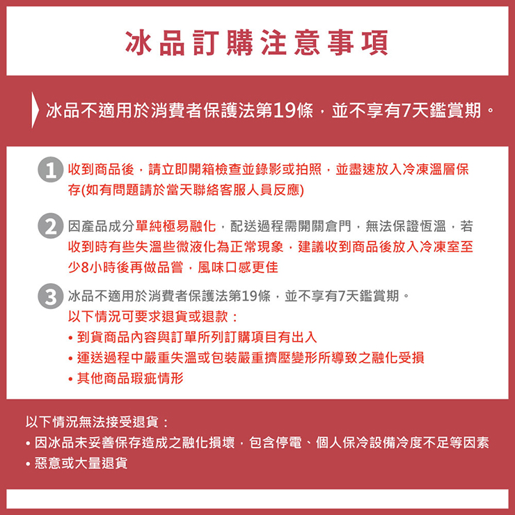 3.依據消費者保護法之規定,食品類商品屬於易於腐敗、保存期限較短之商品,鑑賞期規範效期在7日內之商品,於收受商品後將無法享有猶豫期之權益且不得辦理退貨。