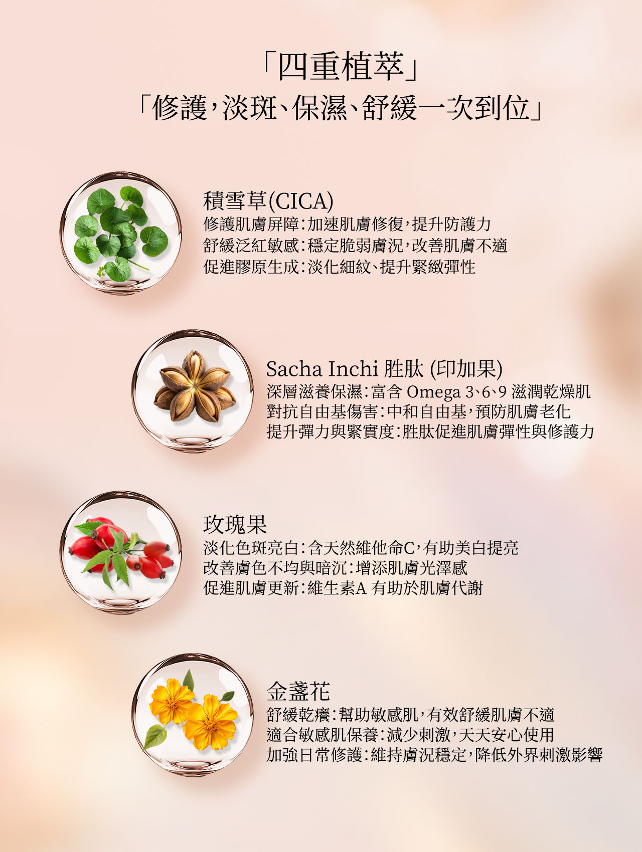 - Sacha Inchi 胜肽(印加果):富含ω-3和ω-6脂肪酸,能強化肌膚屏障,提升保濕能力,有效減少水分流失。