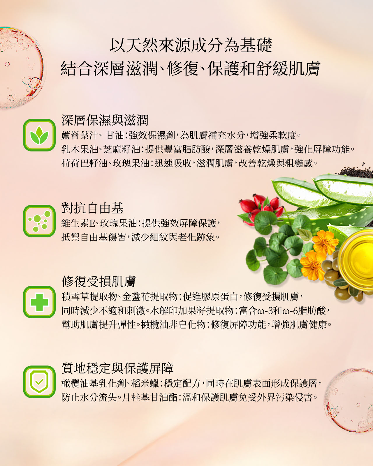 自然植粹全方位對抗老化,淡化細紋煥發水潤嫩肌100%天然成分 | 0%人工香精 | 0%有害化學物質